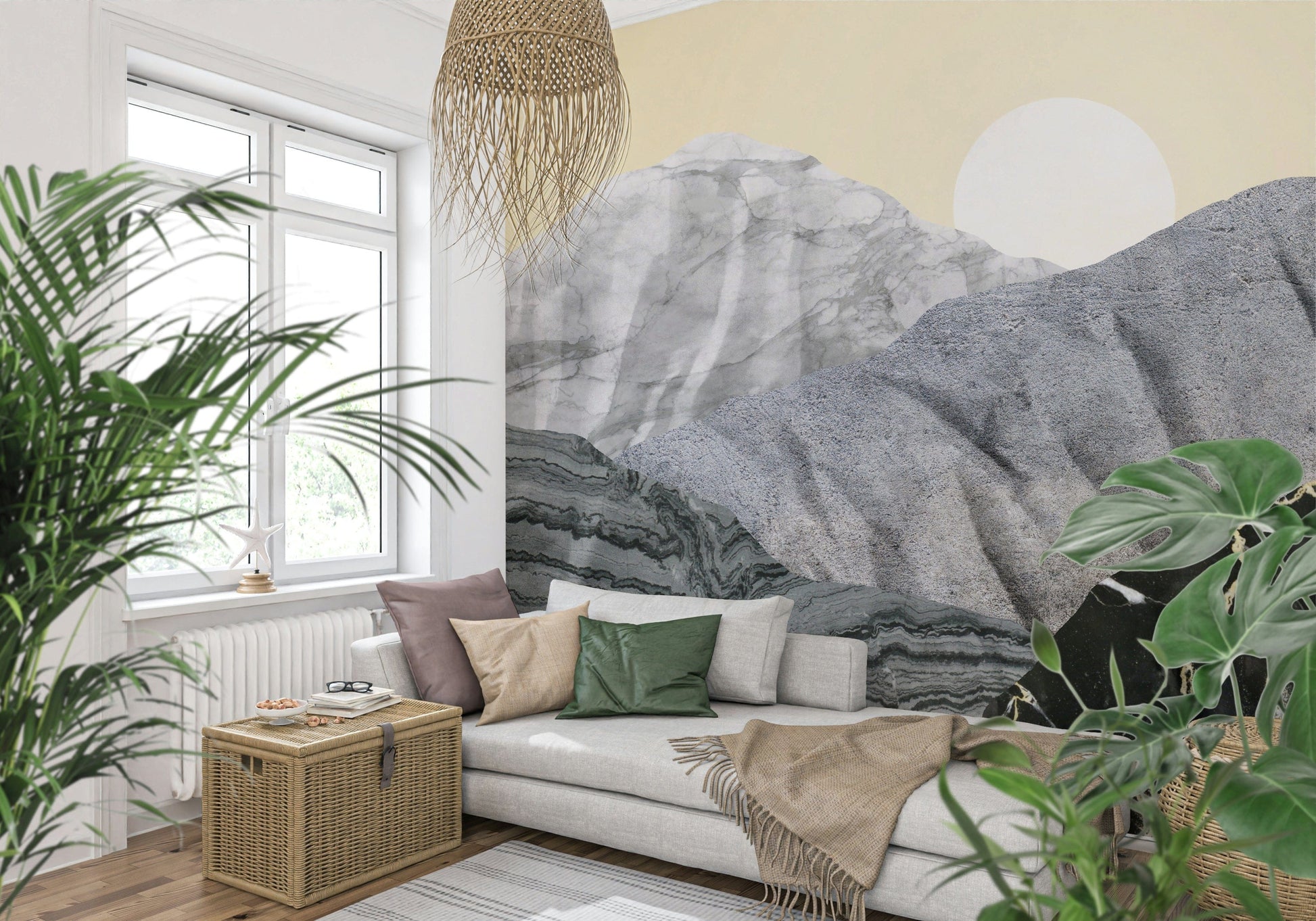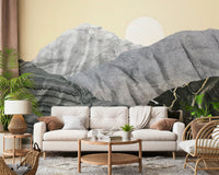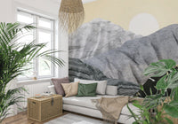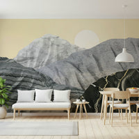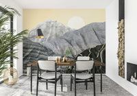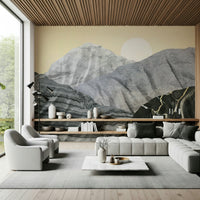 Transform your space with Stony Peaks, a stunning landscape portrayal. Mineral-like formations rise against a pale yellow sky. A crisp sun completes this unique scene. The design utilizes varied textures. Colors range from light grey to black, creating depth. Consider this wallpaper for walls for your living room, study, or dining area. It provides a contemporary, artistic focal point. It complements clean lines and natural materials.