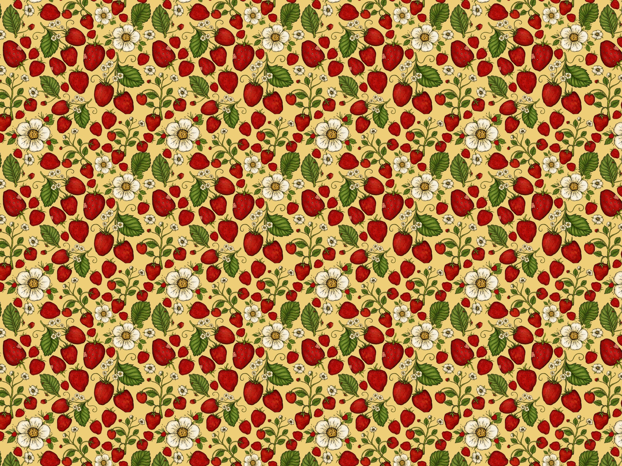 Red strawberry pattern on warm yellow wallpaper for charm.