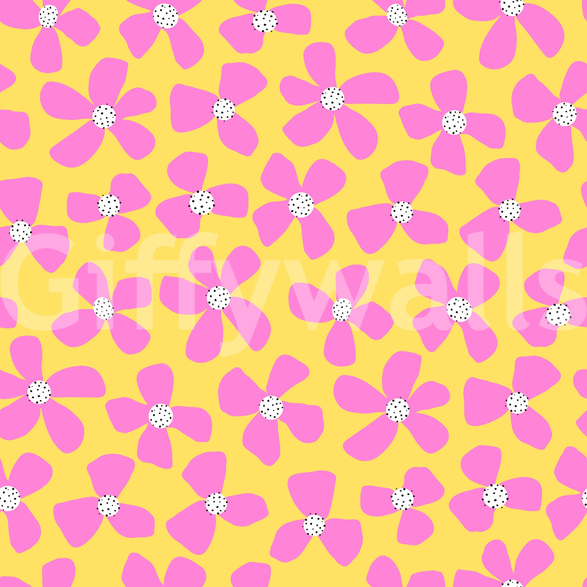 This vibrant wallpaper design features a playful scattering of stylized pink flowers on a sunny yellow background. The flowers, with their bold shapes and simple polka-dot centers, create a cheerful and energetic mood, reminiscent of a summer meadow. The bright colors and simple forms make it a versatile choice for various rooms, injecting a dose of fun and optimism into any space. It's perfect for adding a touch of modern whimsy to bedrooms, kitchens, or playrooms, offering a refreshing aesthetic that's both eye-catching and uplifting. The pattern is seamless, providing continuous visual appeal across any surface.
