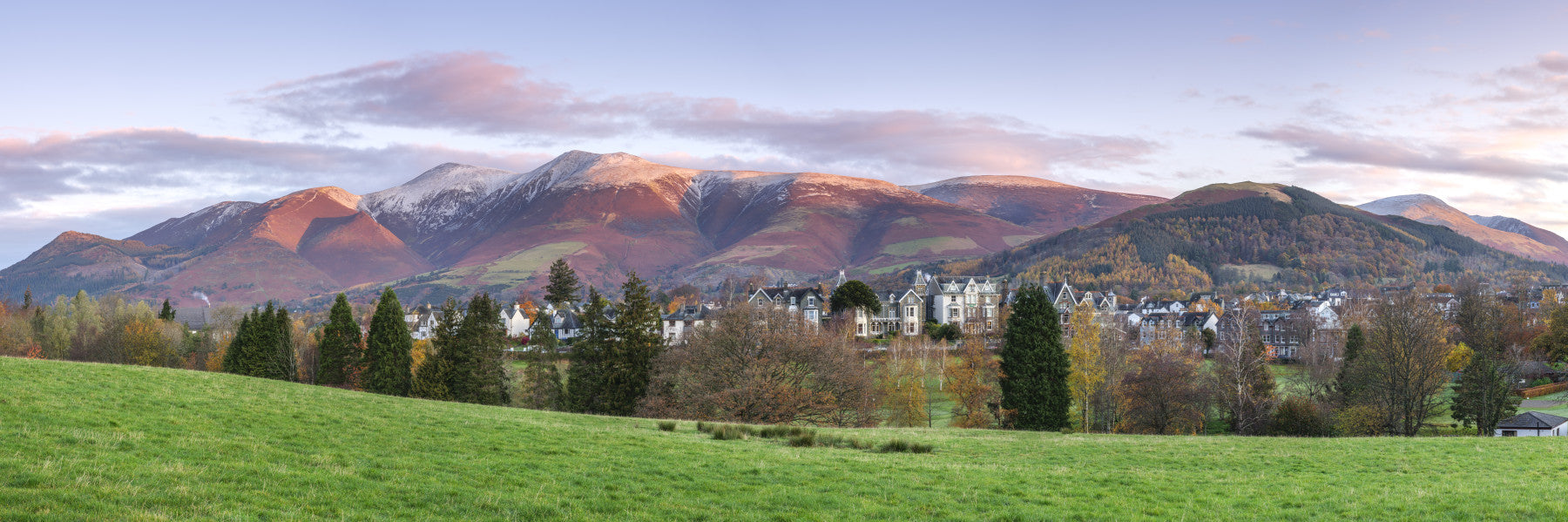 Skiddaw Mountian, Keswick, Lake District. Capture the serene beauty of Keswick at dawn with this landscape. Rolling green fields meet the charming town nestled before majestic mountains. The sky transitions from soft blues to warm pinks as the sun rises. This beautiful image works as wallpaper for walls, bringing peace to living rooms, bedrooms, or any space needing a touch of nature. The colors create a calm mood, complementing interiors with a blend of nature and classic charm.