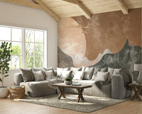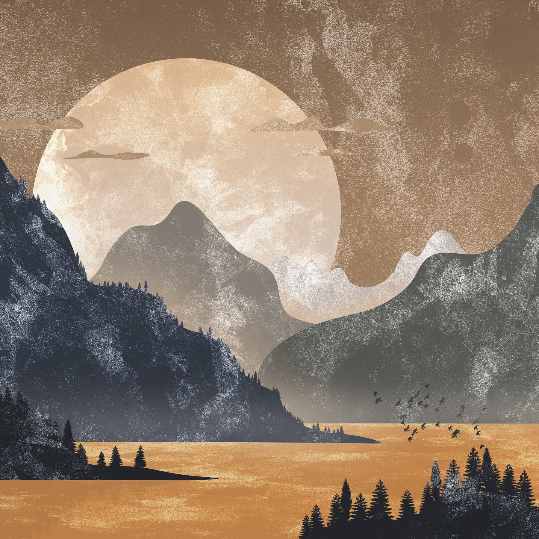 Experience the magical allure of this wallpaper, featuring a stylized depiction of a mountain range bathed in the warm glow of a setting sun or rising moon. The image employs a blend of earthy tones, creating a sense of quietude and serenity. The artistic approach, with its textured background and simplified shapes, generates a contemporary yet timeless aesthetic. Perfect for those seeking a sophisticated and calming atmosphere, this wallpaper brings a touch of natural beauty to any space.