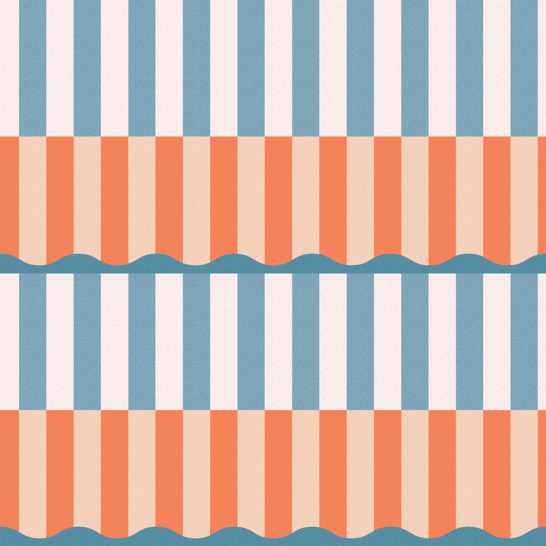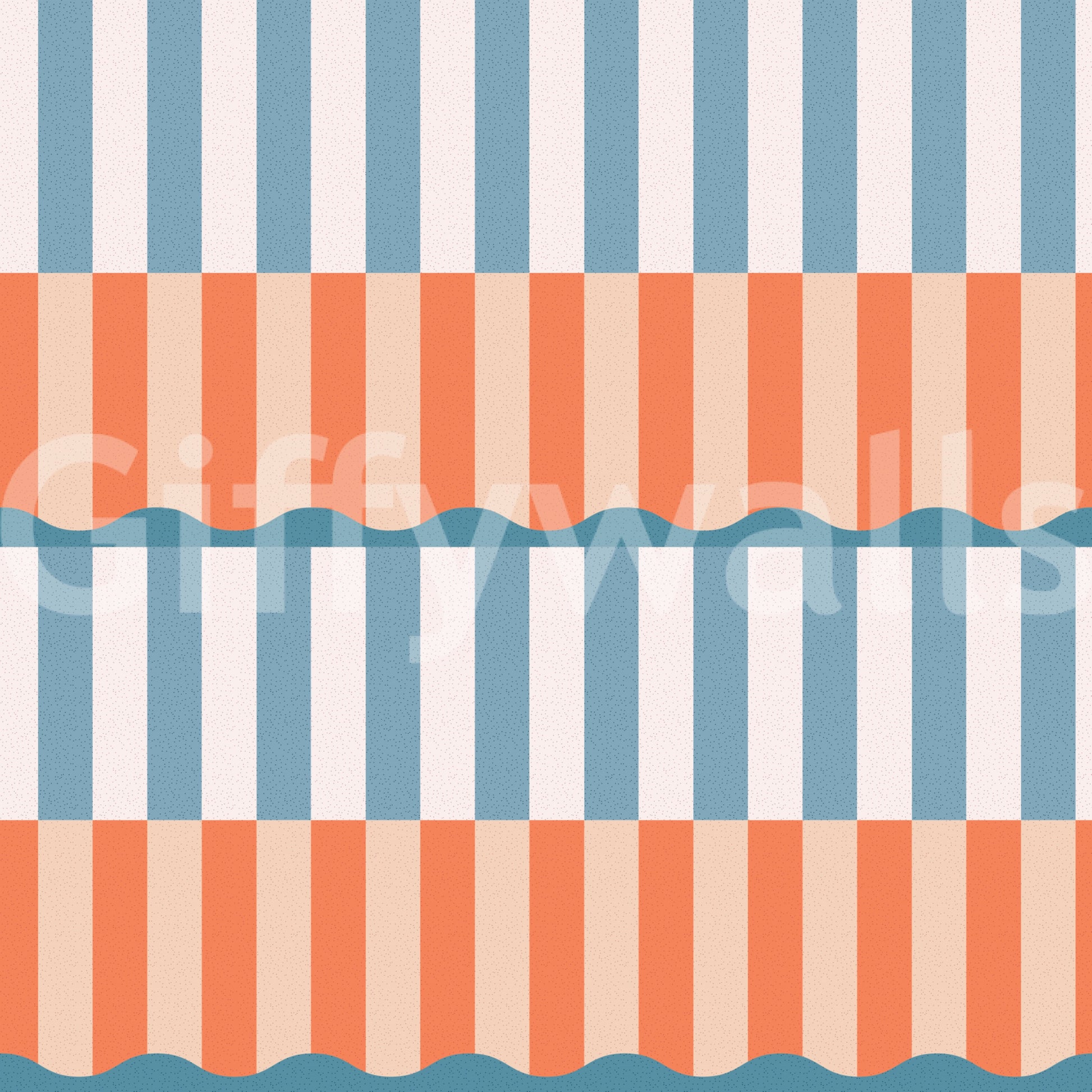 Sunset Waves captures the carefree rhythm of the seaside with bold, alternating stripes inspired by beach cabanas and coastal parasols. The soft coral-orange and ocean-blue palette evokes sunshine reflecting off gentle waves, while the playful wavy border adds a touch of movement and joy. Perfect for lovers of modern coastal vibes and bold minimalism geometry.
