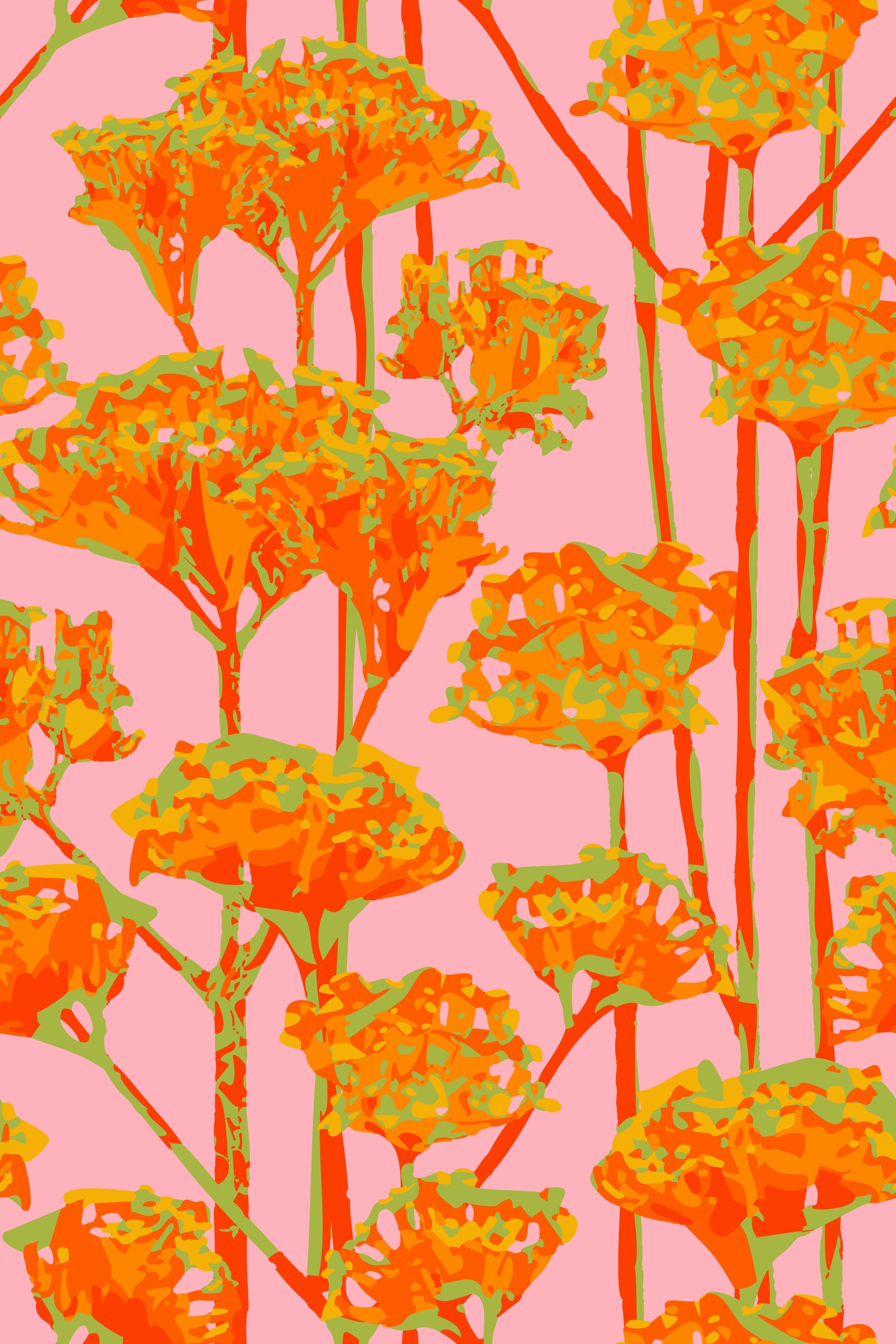 Immerse yourself in the vibrant color of Summer with this Sunshiney abstract floral wallpaper. Playful abstract flowers unfold against a soft blush backdrop, instantly infusing any space with a cheerful and uplifting energy. The bold orange, yellow and green floral clusters, supported by slender coral stems, create a captivating pattern reminiscent of a sun-drenched meadow bursting with life. This design perfectly captures the essence of a bright Summer day, offering a delightful escape into a world of colorful botanicals, a guaranteed mood booster and a stylish statement piece for any room. Bring the joy of warm sunny days indoors and let this colorful floral scene transform your walls into a lively botanical haven. This pattern design is also available in Other Colourways too! Original wallpaper pattern design by Jackie Tahara of UnBlink Studio.