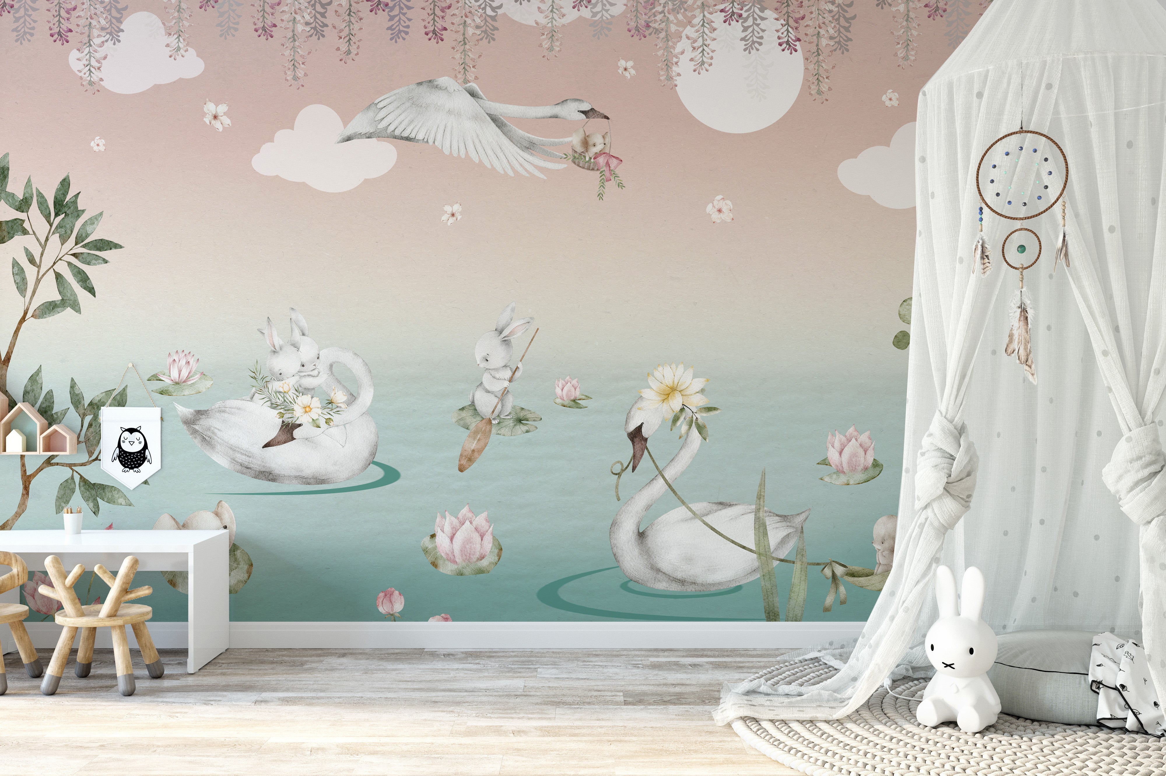 Add a touch of whimsical charm to your little one's haven with the swan lake wall mural, specially crafted for kids room wallpaper. This enchanting scene is a serene symphony of soft-hued swans and playful rabbits amidst a fantasy lily pond. Illustrations of gentle wildlife and floating bubbles bring a storybook quality to any room, sparking imagination and storytelling. Watch as your child's eyes light up with delight each day in a room that's now a magical playground. Perfect for nurturing a love for nature and animals, this wall mural ensures your child's bedroom or play area is a destination for adventure and dreams.