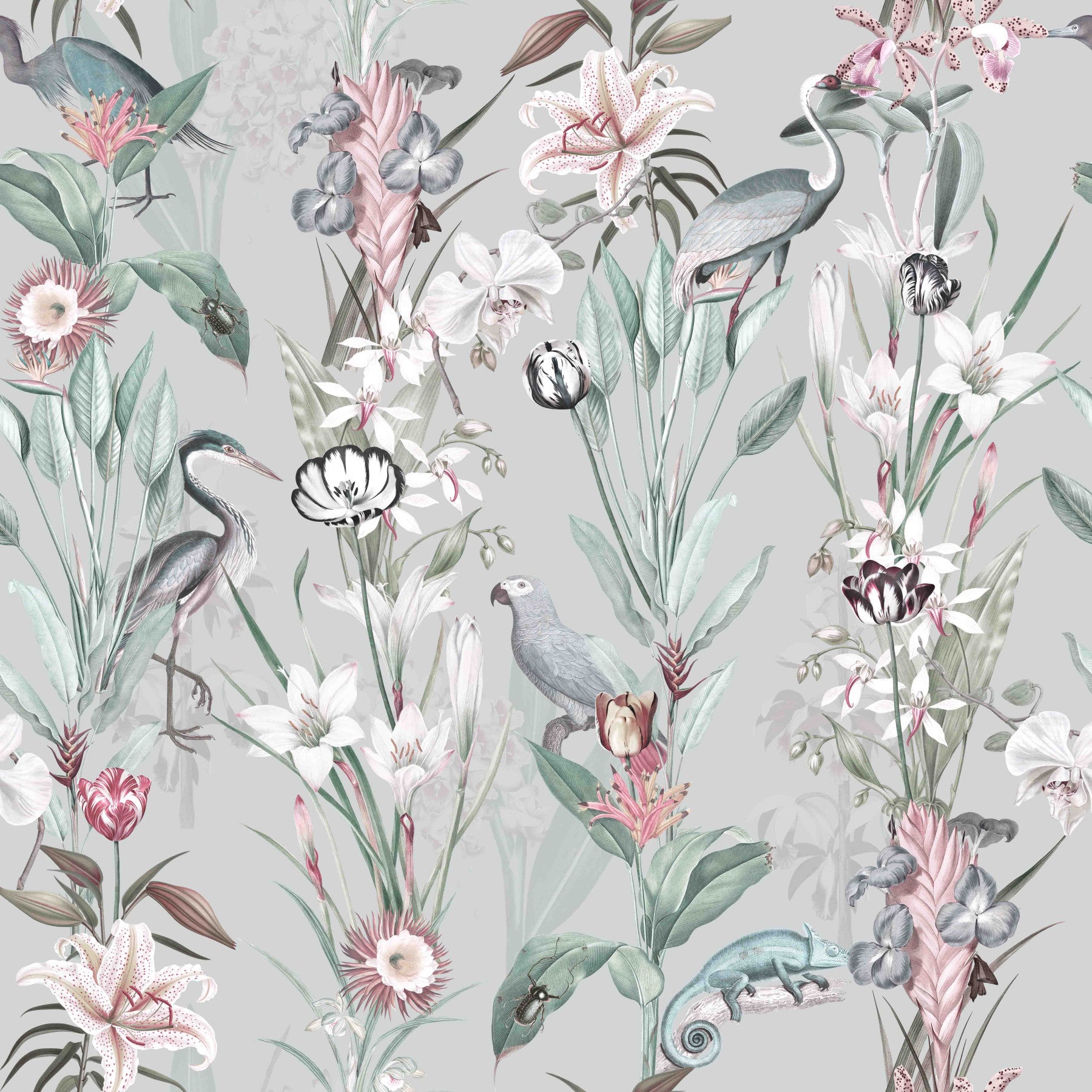 Escape into a serene and whimsical world with "Sweet Dream 01". This dreamy wallpaper transports you to a tranquil garden where exotic flora and fauna coexist in delicate harmony. Gentle hues of pastel pinks, soft whites, and muted greens dance across the surface, creating a soothing visual experience. Elegant herons stand gracefully among blooming lilies and orchids, while a curious parrot observes the scene. A serene chameleon adds a touch of playful charm, making this wallpaper a perfect choice for creating a restful and enchanting atmosphere in any space.