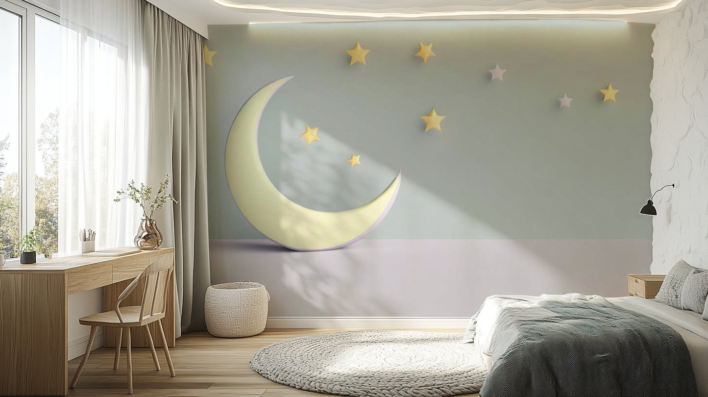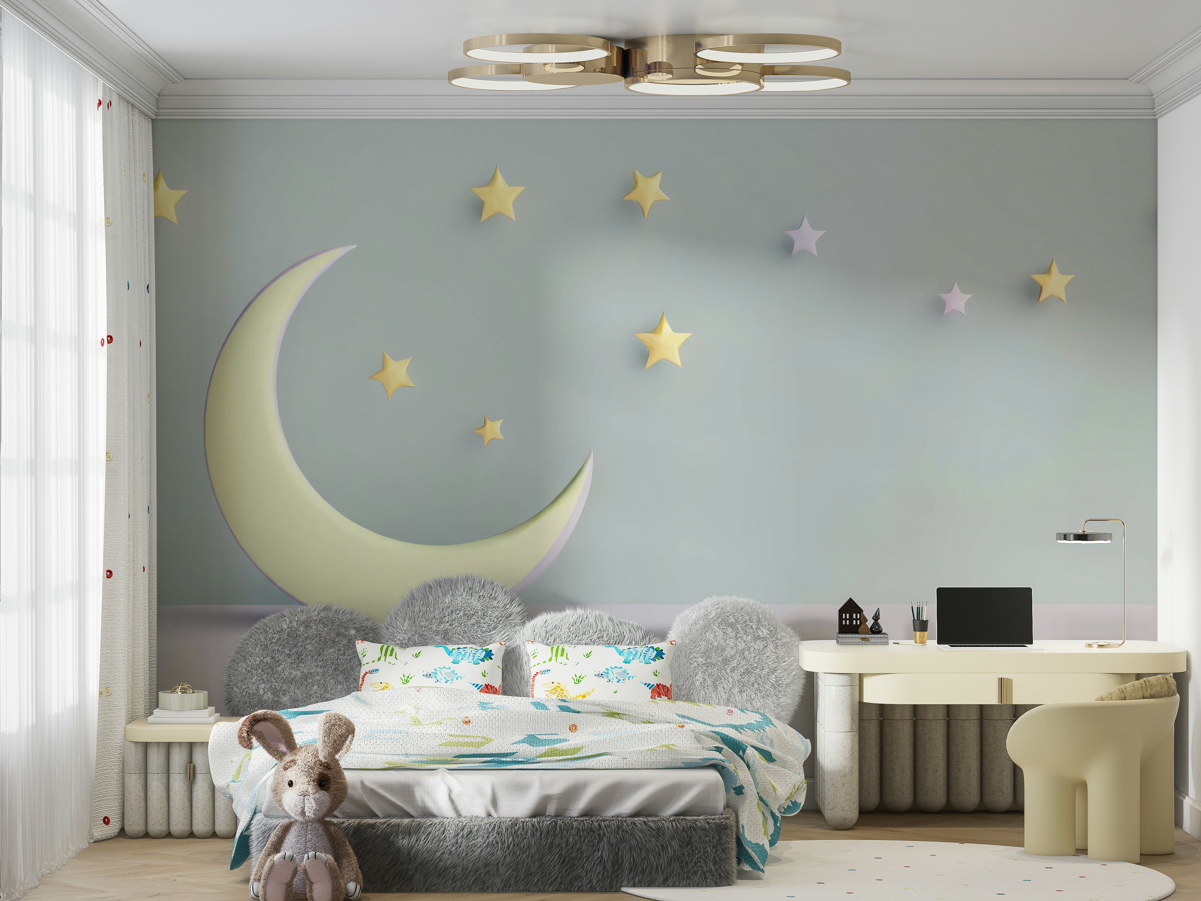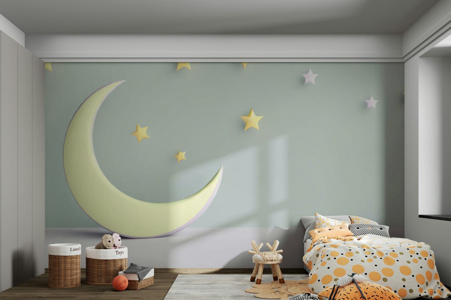 Drift into a peaceful slumber with this serene wallpaper featuring a soft yellow crescent moon and twinkling stars on a gentle pastel green background. The minimalist design and calming color palette create a soothing atmosphere perfect for a nursery or children's room. The simplistic and understated elegance makes it versatile for various interior styles, promoting a sense of tranquility and rest. Let this celestial scene inspire sweet dreams and peaceful nights for your little ones, creating a cozy and comforting space.