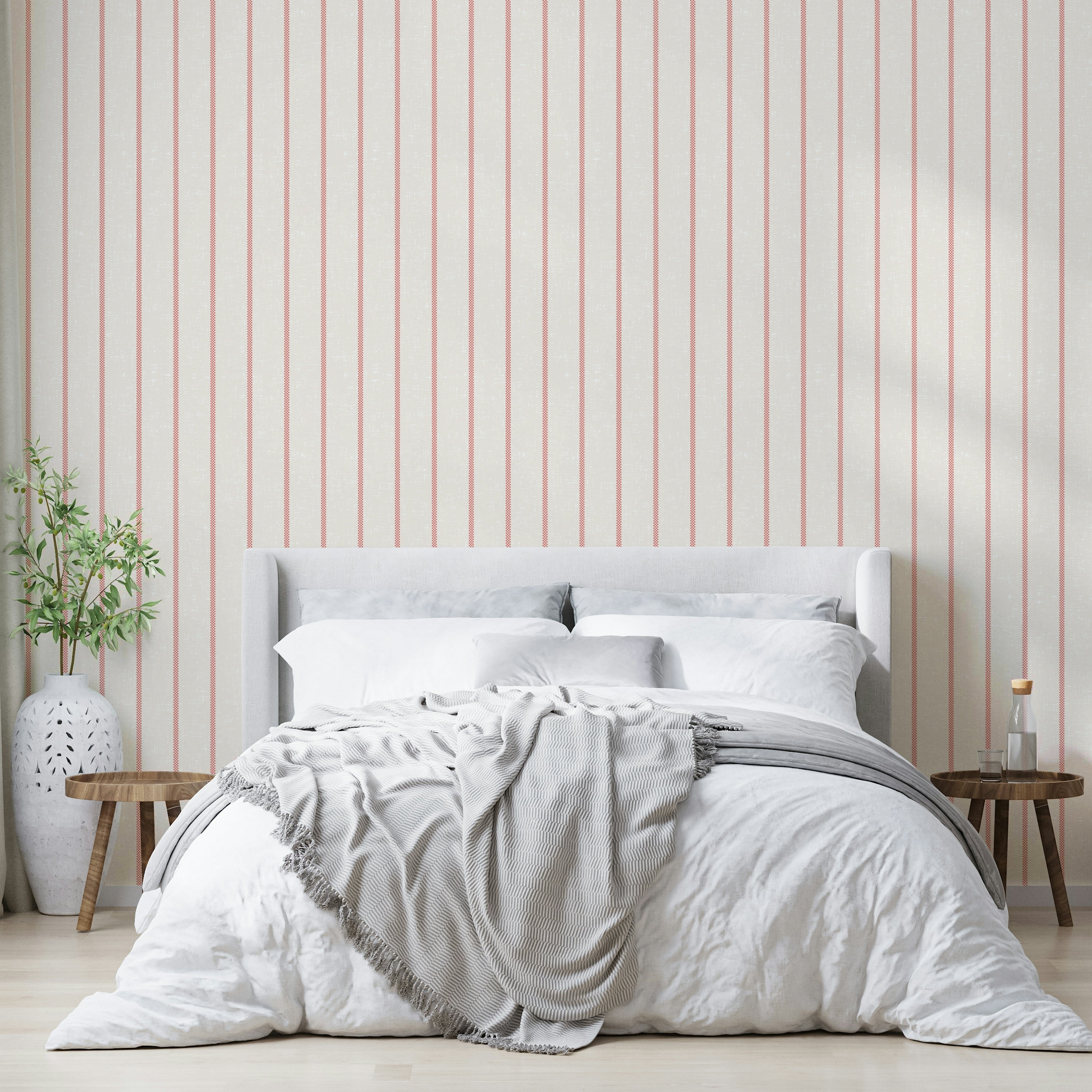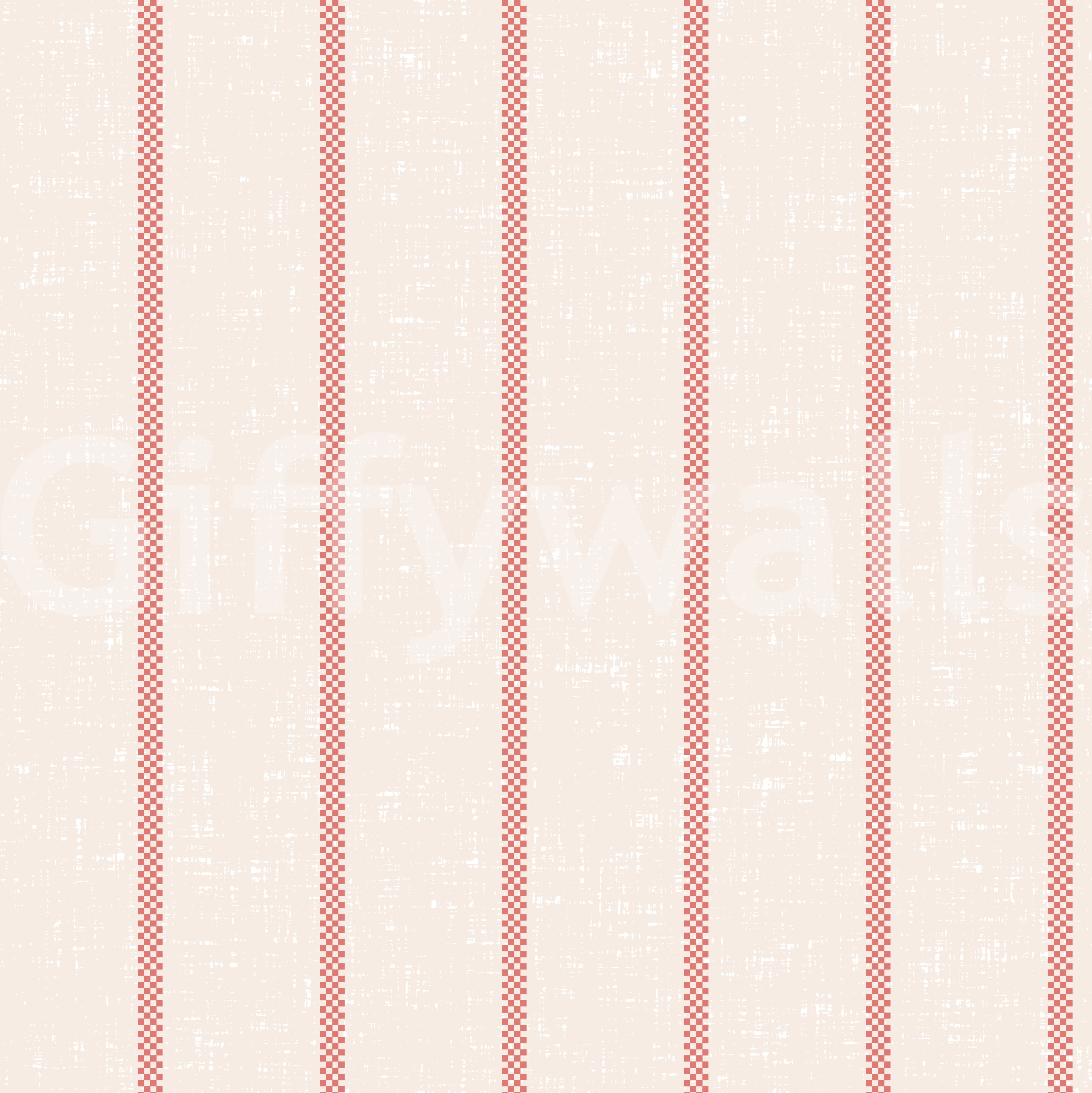 Embrace a touch of rustic charm with this 'Tea Towel Stripe - Red' wallpaper. The design features delicate, vertically-aligned stripes of a soft coral red checkerboard pattern, set against a subtly textured, off-white background. This understated yet stylish wallpaper evokes the cozy feeling of a vintage tea towel, bringing a sense of warmth and simple elegance to any space. The slightly distressed background adds depth and character, enhancing the overall homely and inviting atmosphere. Perfect for kitchens, bedrooms, or any room needing a touch of refined country style.