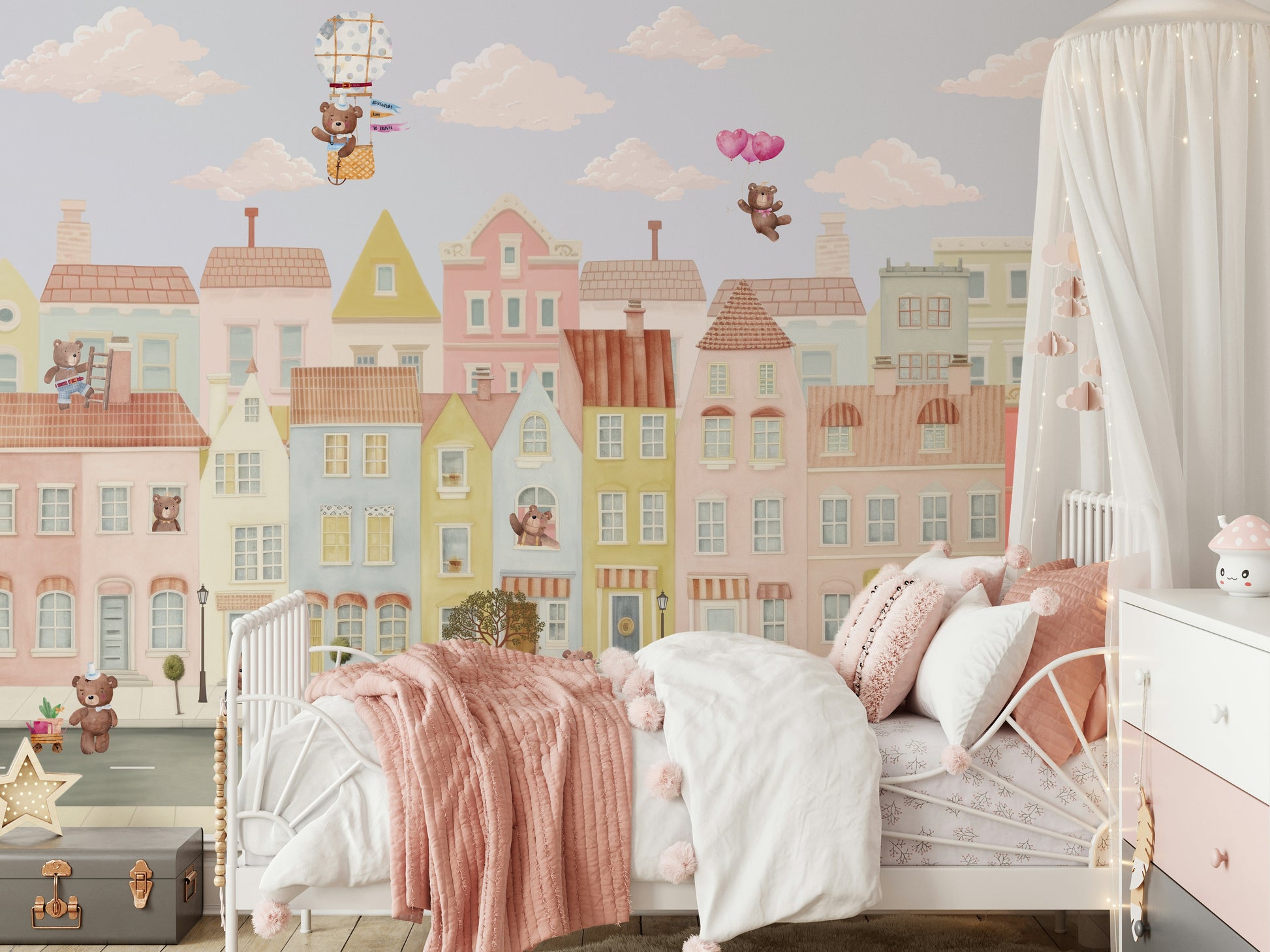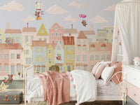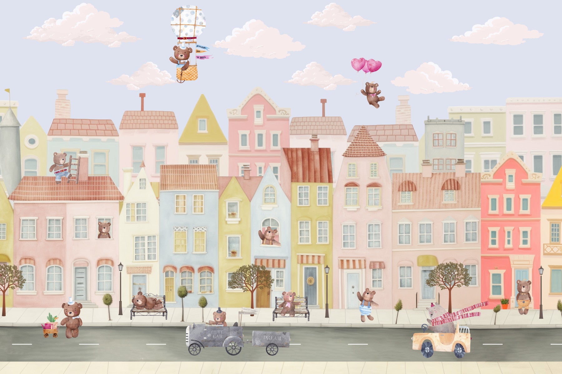 Create a cheerful and imaginative space with this engaging wallpaper for walls. It features a delightful town of pastel buildings occupied by charming teddy bears. Watch the bears enjoy their adventures, from flying high in a hot air balloon to driving in their own miniature cars. This whimsical design is perfect for kids' rooms, playrooms, or nurseries, offering a dreamy escape within your interiors. The soft colors and child-friendly art blend nicely with rooms seeking a happy feel.