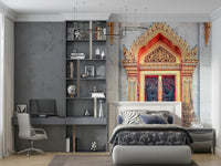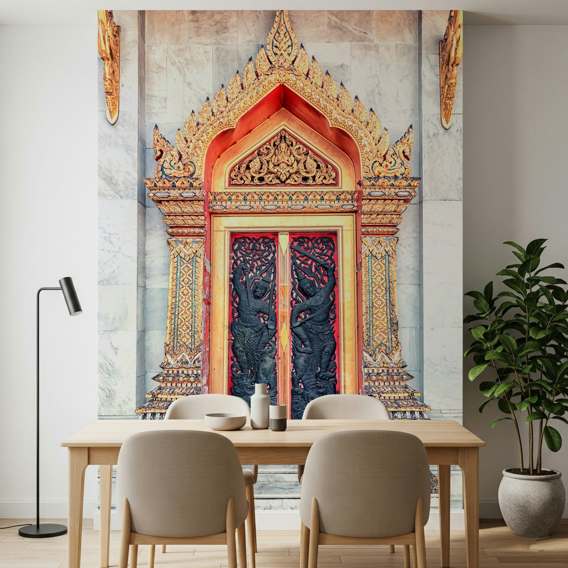 Transform your living space with this captivating wallpaper for walls, featuring an ornate temple gate. The intricate carvings and rich gold details against a marble backdrop infuse any room with a sense of history and culture. The contrasting black figures offer a dramatic visual that commands attention. Consider it for a foyer, living room, or study to create a sophisticated atmosphere. This wallpaper adds depth and dimension, turning a plain wall into a captivating feature. It complements both modern and traditional interiors.