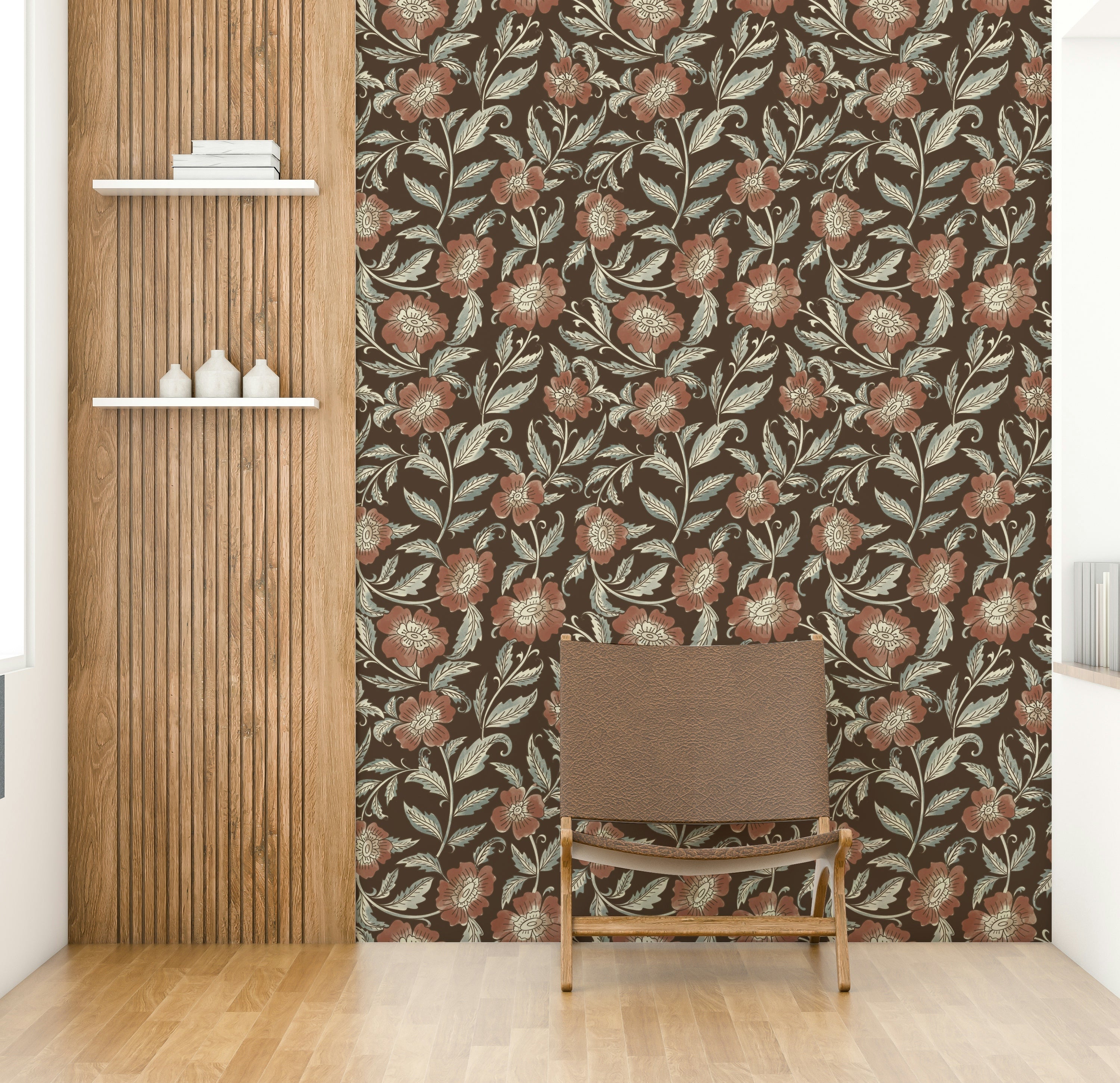 Journey through a landscape of 'Terracotta Trail', a wallpaper design evoking a sense of serene exploration. The rich terracotta tones of the watercolor flowers intertwine with delicate, muted green leaves on a deep brown canvas. Each bloom is rendered with artistic finesse, showcasing a unique blend of hand-drawn elegance and a tranquil, almost meditative quality. This wallpaper design is ideal for those seeking a subtle yet impactful way to introduce nature-inspired style and quiet sophistication into their living spaces.