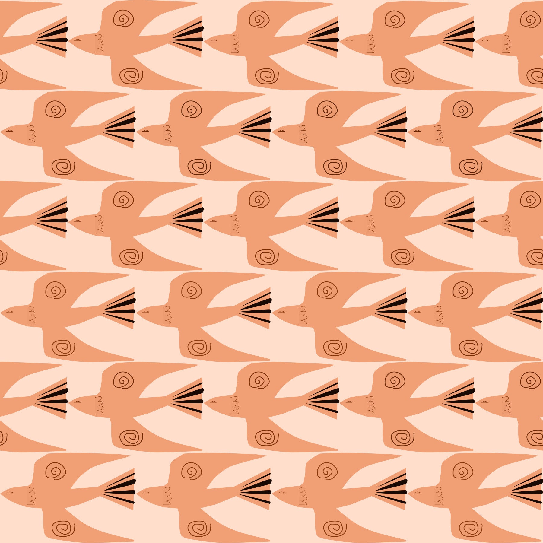 Elevate your space with Terracotta Doves a wallpaper that exudes tranquility and artistic charm. This captivating design features stylized doves in a warm terracotta hue, set against a soft, complementary backdrop. The repeated pattern creates a sense of peaceful movement, as if these gentle birds are gracefully soaring across your walls. Each dove is adorned with unique spiral detailing, adding an element of subtle sophistication and intrigue. The clean lines and minimalist aesthetic make 'Terracotta Doves' a versatile choice for any room, from living areas and bedrooms to studies and nurseries. Infuse your home with a touch of earthy elegance and serene beauty with this timeless wallpaper.