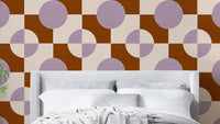 This wallpaper design showcases a captivating interplay of textures and muted tones. The image features a seamless pattern composed of overlapping circles and squares in soft lavender, creamy beige, and rich brown hues. Each shape is rendered with a distinct linen-like texture, creating a tactile visual experience. The minimalist geometric design offers a sense of calm and understated elegance, making it ideal for a variety of spaces, from living rooms to bedrooms. The harmonious color palette evokes feelings of serenity and sophistication, while the repeating pattern provides a sense of visual rhythm and balance.