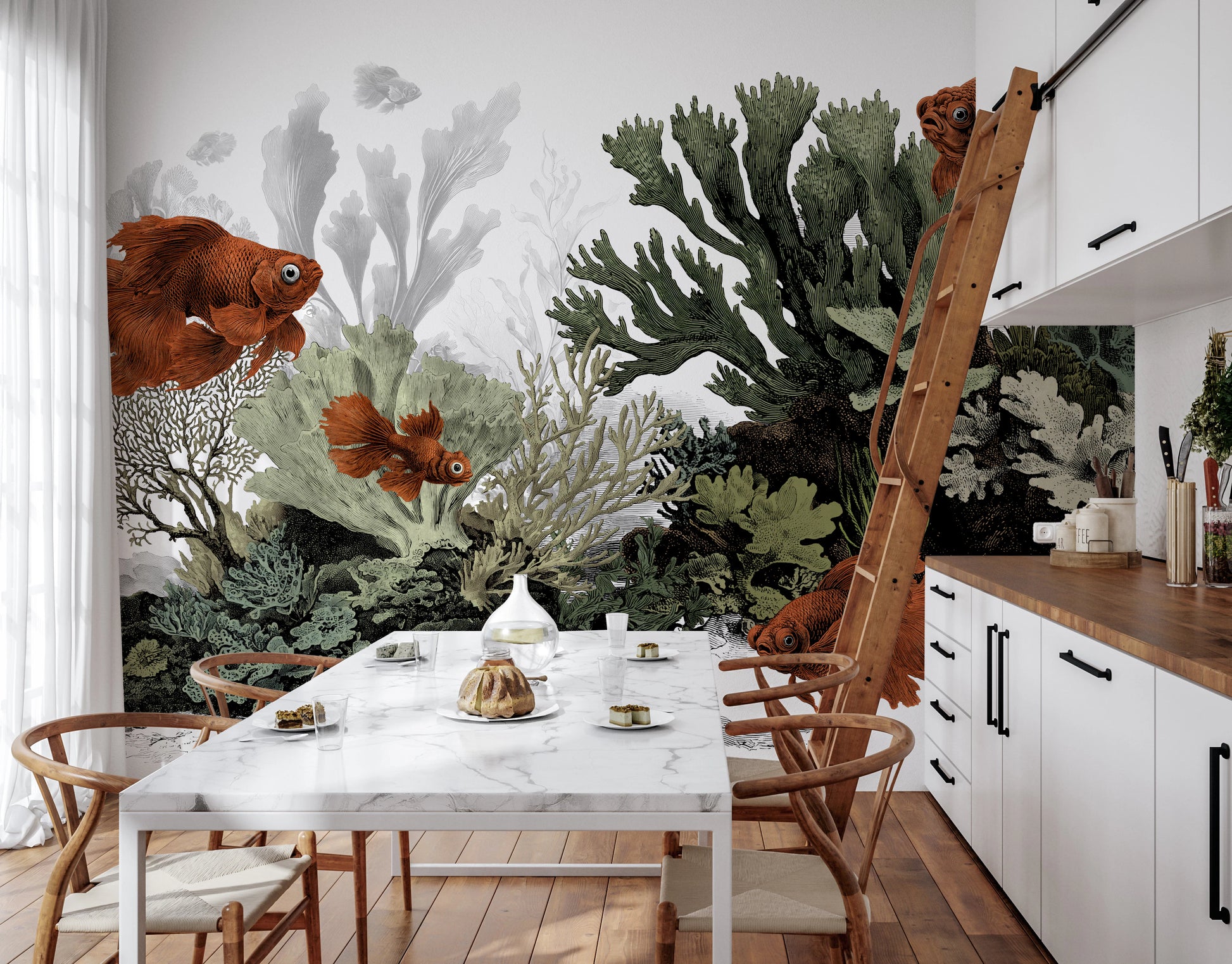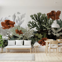 The Aquarium - Clean White wallpaper brings a calm underwater vibe with a vintage illustration feel. Rusty orange fish drift through soft sea-foam greens, misty blue-gray water, and detailed coral and seaweed in layered textures. The muted palette keeps it relaxed while the intricate reef pattern adds interest up close. Use this wall mural in a bathroom, nursery, reading nook, or coastal-inspired living room to support an easy, thoughtful interior design scheme.