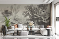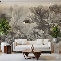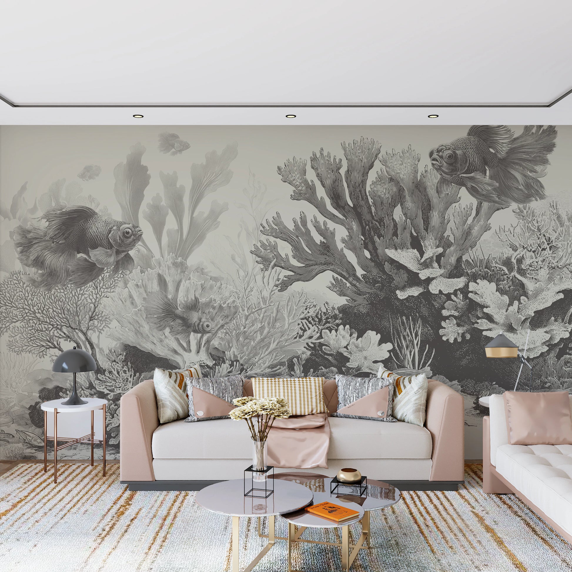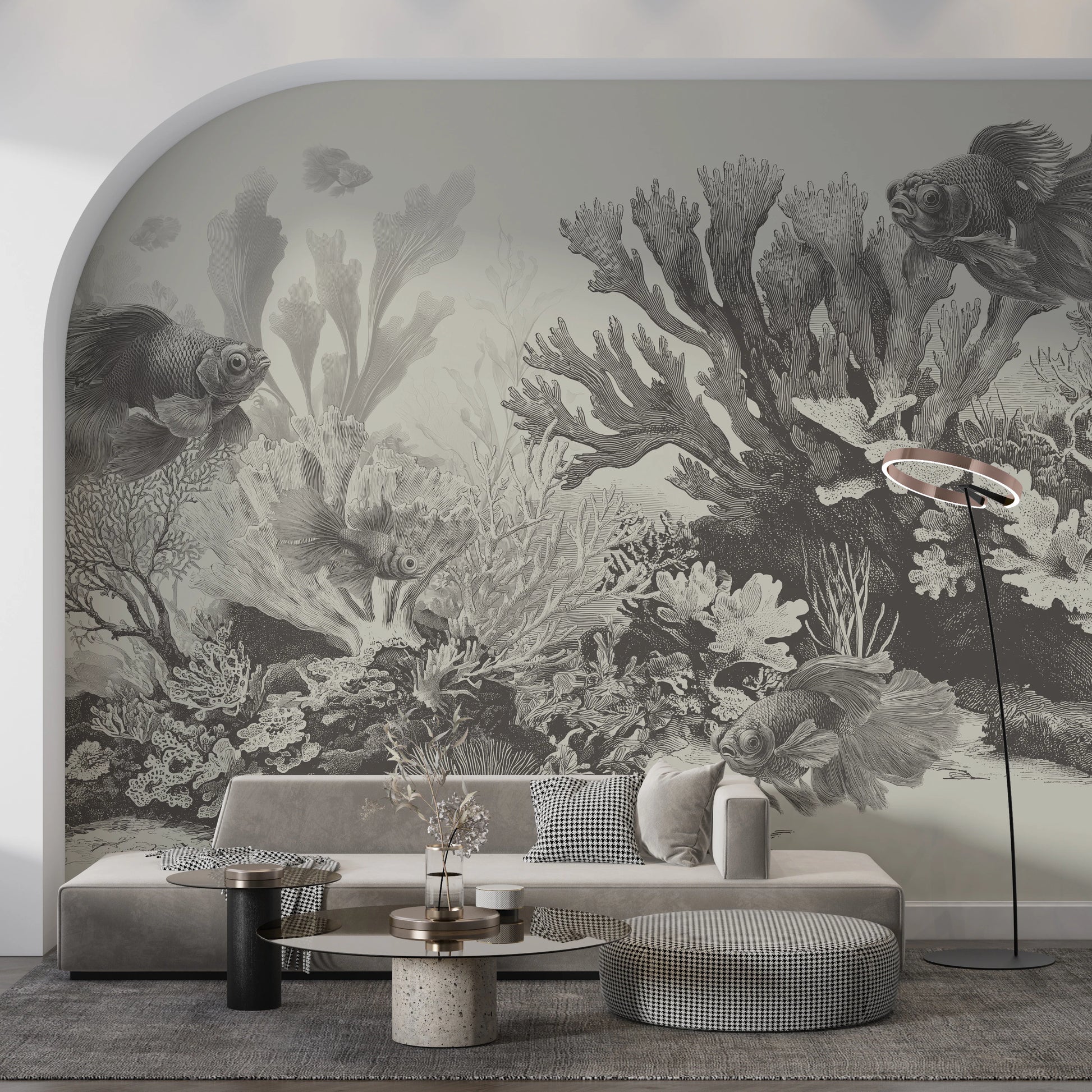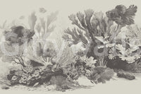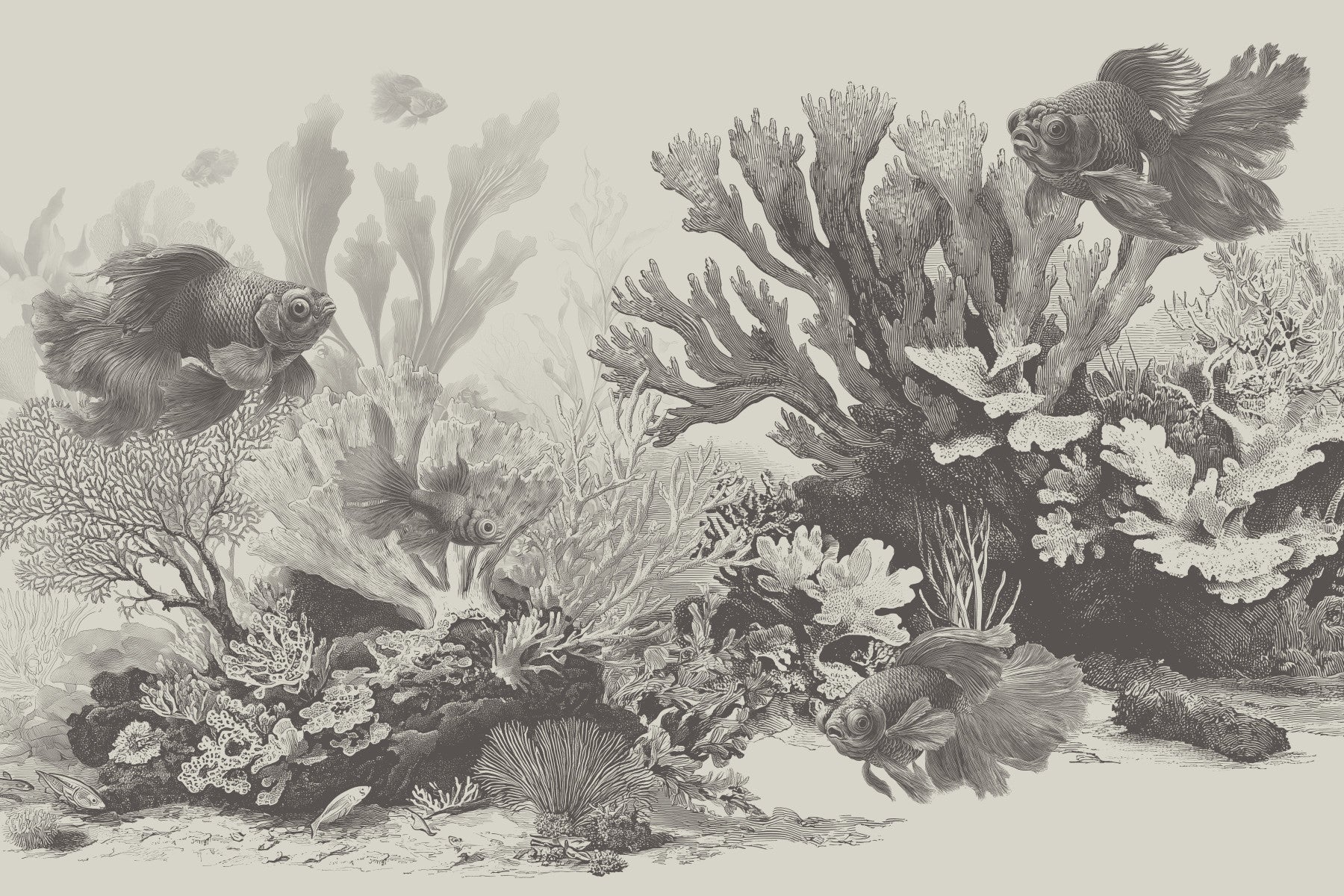 The Aquarium - Greige wallpaper brings a calm, underwater feel to your interior design. Detailed fish glide through a reef of coral, sea fans, and soft plant shapes, all illustrated in a soft warm grey range on a rich cream background. The pattern has a vintage engraving look that feels both classic and modern. Use this wall mural in a bathroom, bedroom, reading nook, or home office for a soothing backdrop, or in a hallway to add gentle visual interest.