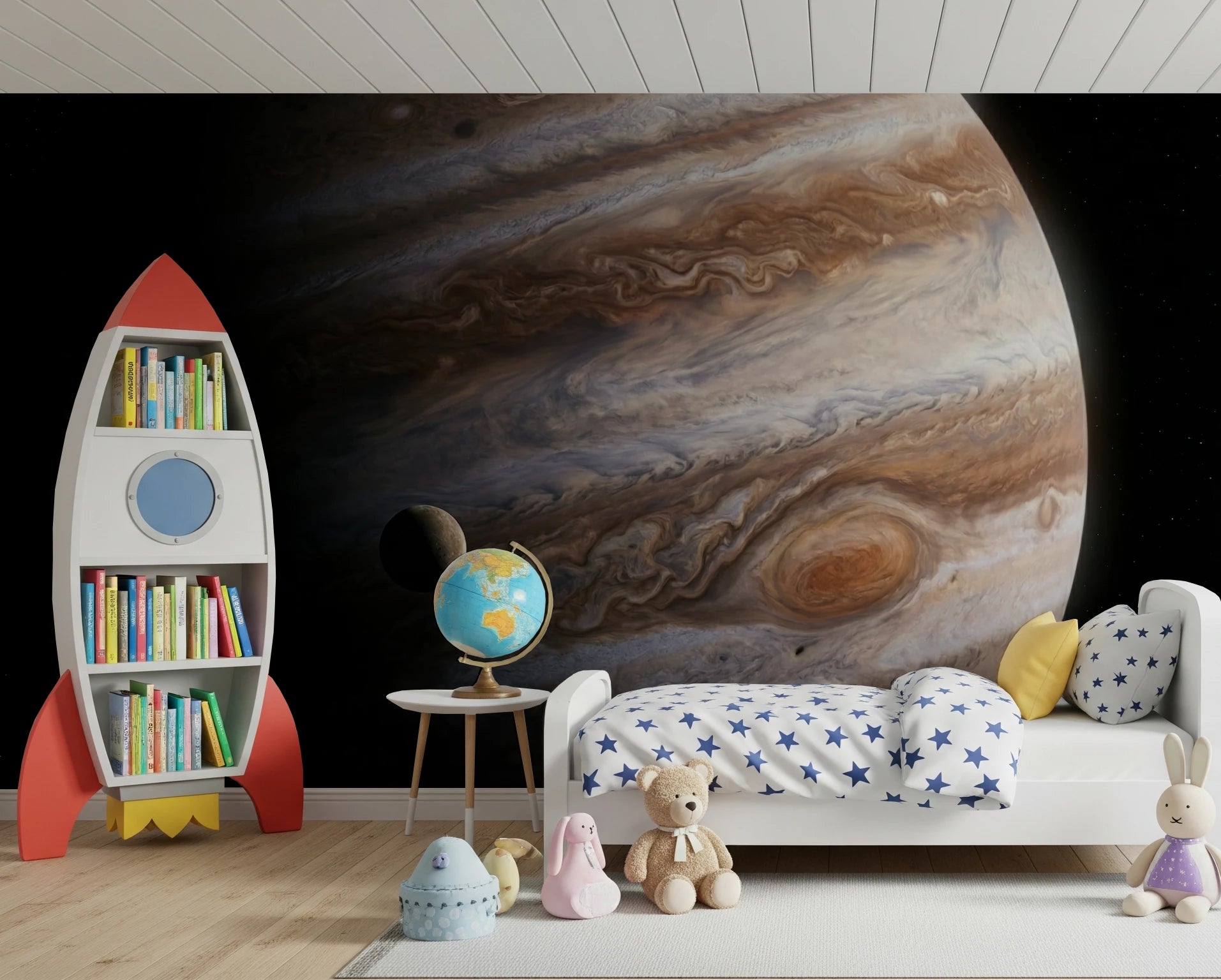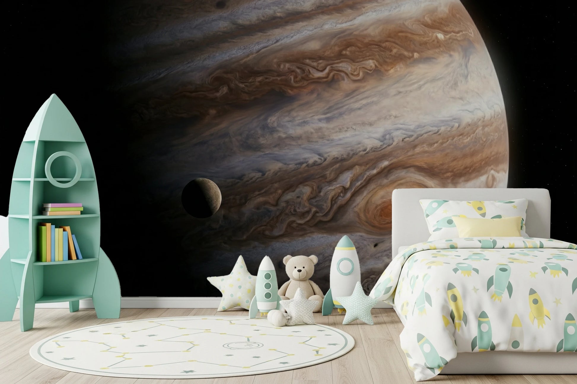 Transform your living space with the awe-inspiring beauty of Jupiter. This wallpaper for walls features the swirling cloud patterns and dynamic colors of the solar system's largest planet. Warm browns, greys, and creams blend in captivating formations, accented by a small moon, offering a unique cosmic perspective. This design adds depth and interest to any room, especially living areas, studies, or bedrooms. The textures and colors create a tranquil, yet engaging atmosphere. Invite the wonders of space into your home, and let this majestic wallpaper become a stunning backdrop to your everyday life.