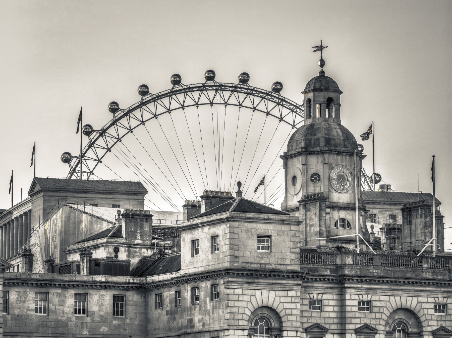 A black-and-white view of London’s Ferris wheel behind historic buildings.