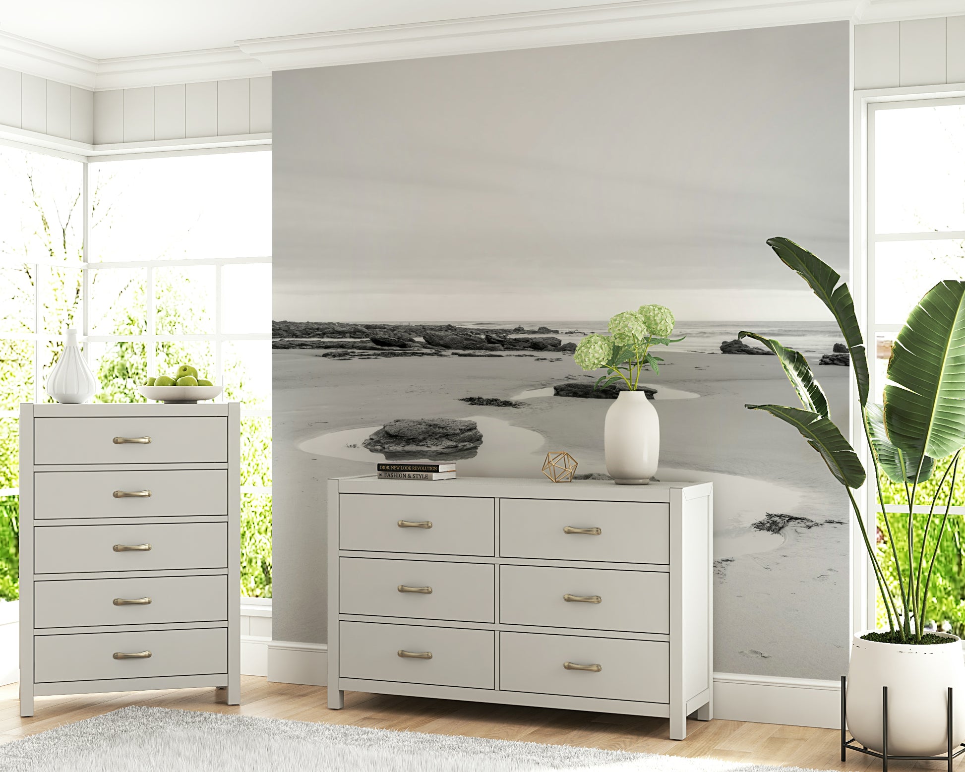 Rock pools on a sandy beach. Capture the serene beauty of the coast with "Tide Pools," a monochromatic masterpiece that evokes a sense of calm and timeless elegance within any space. This art piece portrays a tranquil beach scene, where the receding tide leaves behind shallow pools reflecting the muted sky above. Jagged rocks, softened by the rhythmic ebb and flow, stand as silent sentinels amidst the vast expanse of sand. The interplay of light and shadow accentuates the textures of the landscape, highlighting the granular details of the sand and the rugged surfaces of the rocks. Let the quiet strength of the ocean transform your walls into a serene haven, offering a peaceful retreat from the everyday.