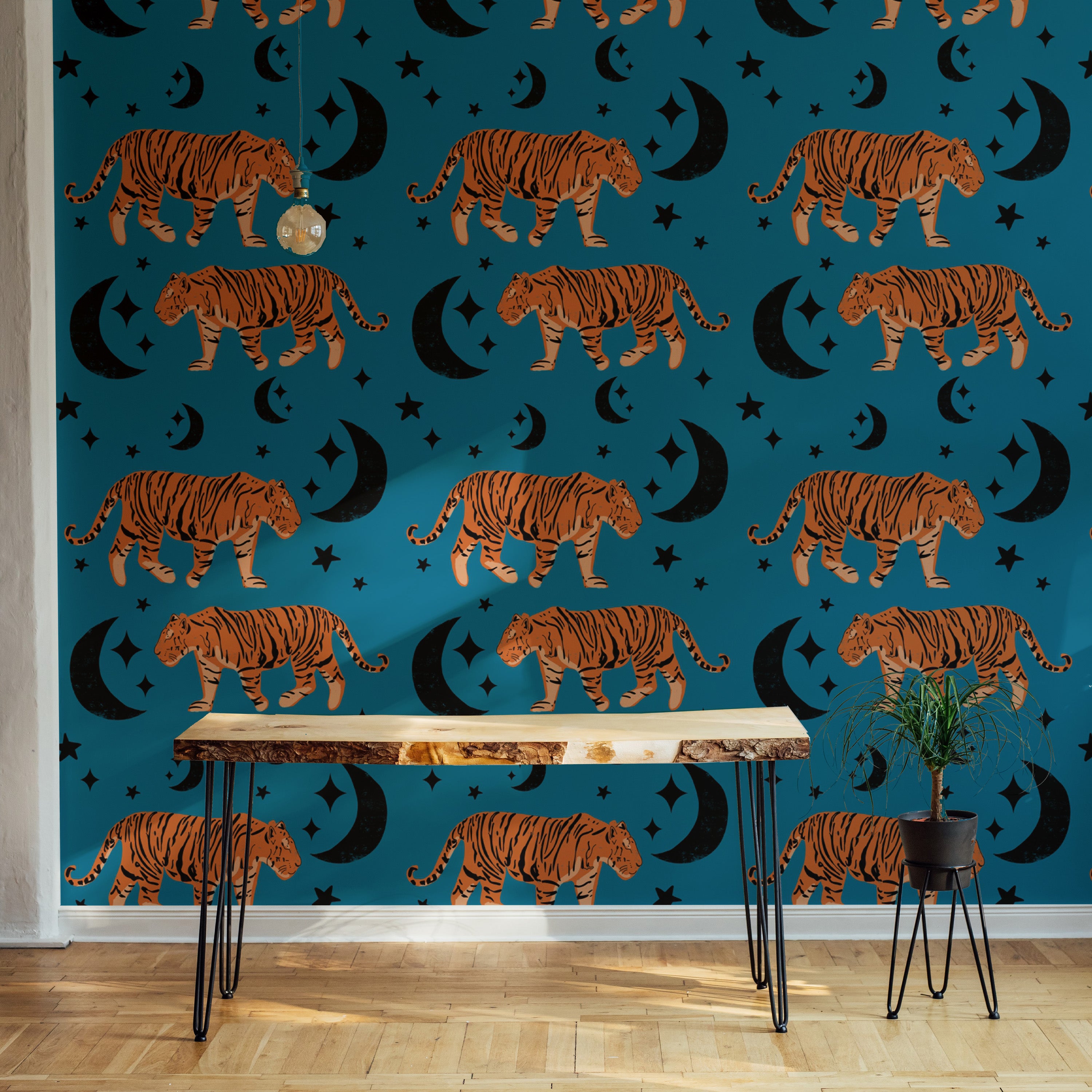 Nature-inspired Tiger Moon Blue Kids Room Wallpaper