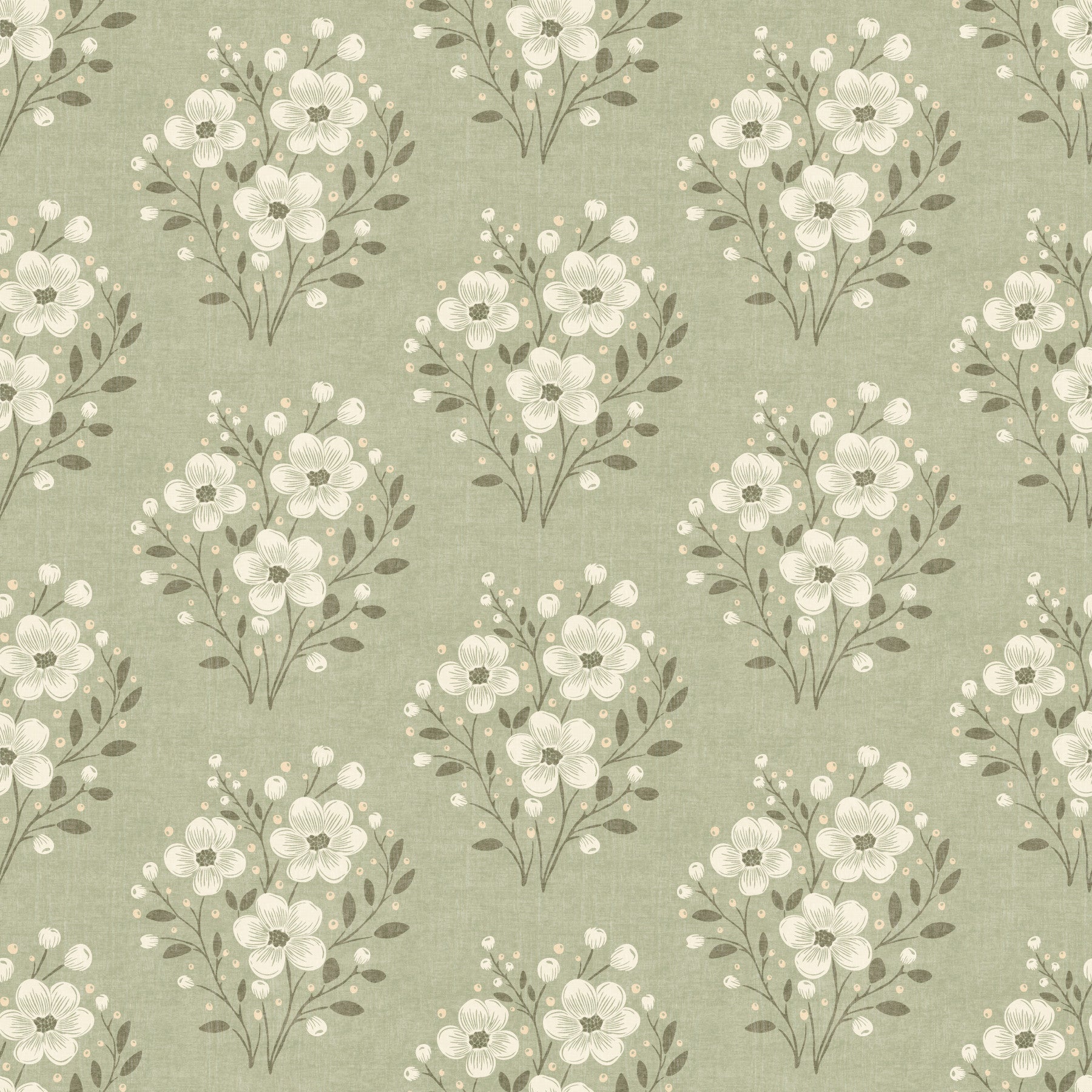 This wallpaper showcases a delicate repeat pattern of off-white blossoms artfully arranged in charming bouquets. The muted sage green background, with its subtle texture, provides a calming backdrop that enhances the timeless appeal of the floral design. Each bouquet is meticulously detailed, creating a sophisticated yet relaxed ambiance perfect for any space seeking a touch of classic sophistication. The soft color palette and refined floral motifs evoke a sense of tranquility and understated beauty, making this wallpaper a versatile choice for bedrooms and living areas.