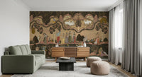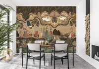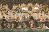 This exquisite wallpaper for walls transports any space into a serene, mystical realm. It features a traditional Indian miniature painting style, showcasing deities like Krishna playing his flute amidst Gopis, peacocks, deer, and sacred cows. Lush, stylized trees with delicate pink blossoms and lotus flowers float on calm waters, rendered in a rich palette of earthy greens, muted browns, and soft beige, accented with splashes of gold, deep red, and Krishna's iconic blue. This design creates a captivating narrative, inviting contemplation and a sense of peaceful grandeur. Perfect for a living room, dining area, or a tranquil bedroom, it infuses interiors with cultural richness and artistic elegance, becoming a magnificent focal point.