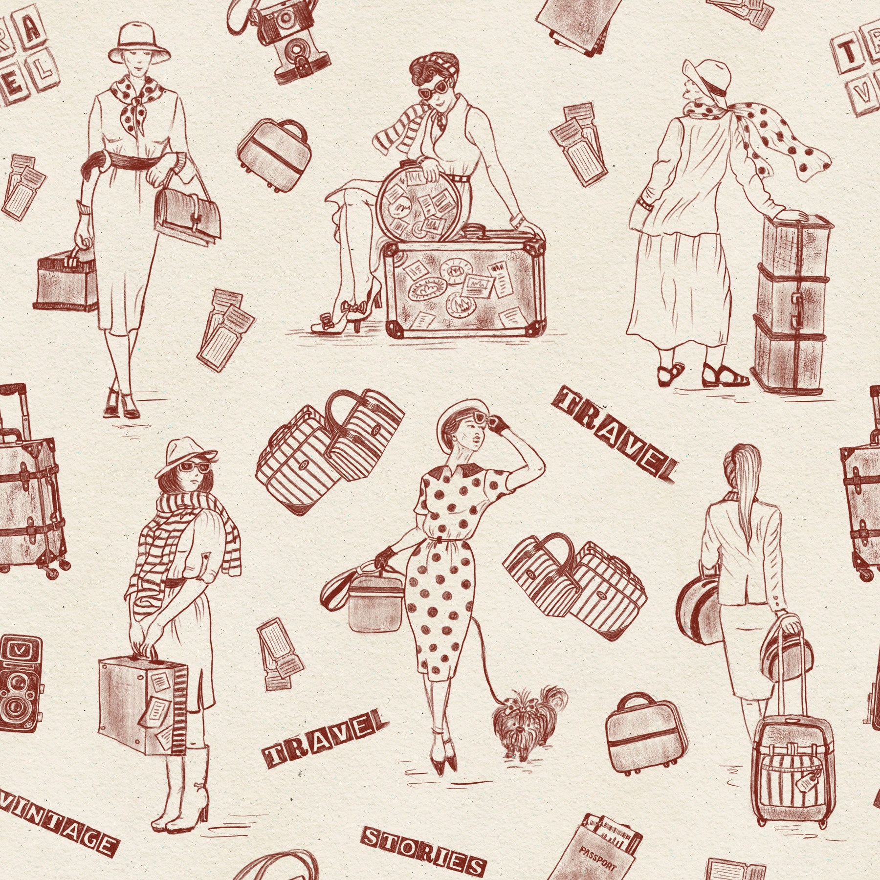 Capture the spirit of exploration with this elegant wallpaper. It shows refined women ready for travel, complete with vintage luggage and accessories. The detailed sketches come alive on a textured background. This wallpaper for walls injects nostalgia into any setting. Great for a study, bedroom, or living area, this design adds a touch of classic charm. Allow this captivating pattern to enrich your space, complementing both modern and traditional decor styles with its unique character.