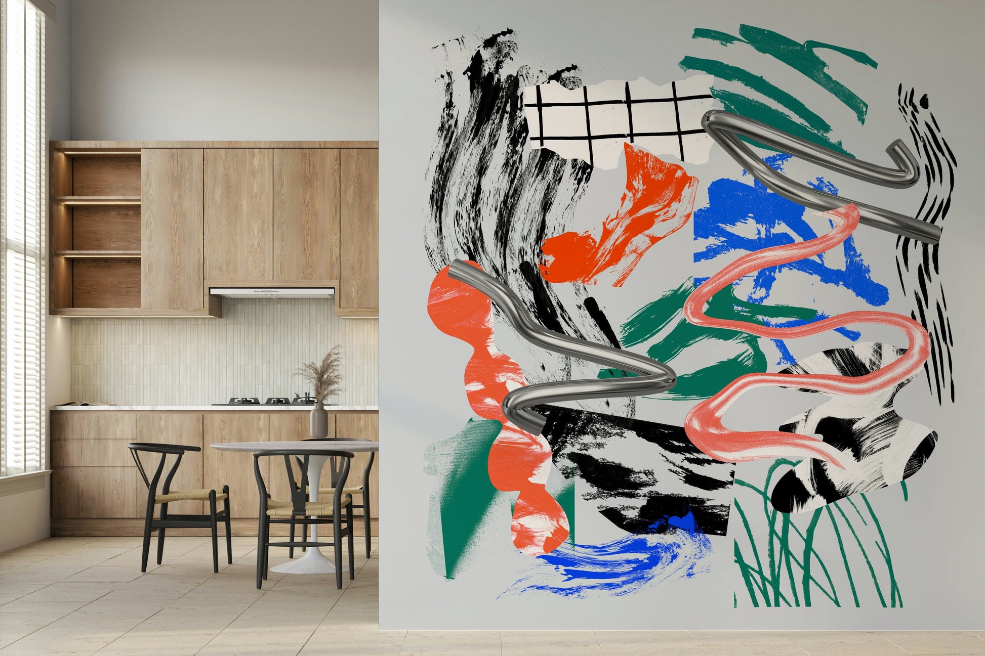 Unleash the raw energy of "Tornado" on your screen. This abstract wallpaper captures the essence of swirling chaos and untamed power, translated into a visually striking composition. Dynamic brushstrokes of black, blue, orange and green collide with rigid geometric shapes and sinuous metallic lines, creating a whirlwind of texture and form. The contrasting elements evoke the unpredictable nature of a tornado, a dance between destruction and awe-inspiring beauty. "Tornado" is more than just a wallpaper; it's a statement. It's a bold expression of dynamism, a reminder that even in the midst of chaos, there is an underlying order and a captivating artistic vision. This wallpaper is perfect for those who embrace the unconventional and seek a visual that resonates with their own unique energy.