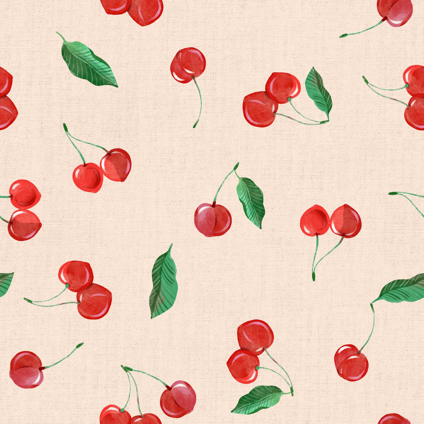 Hand-painted cherries tossed across soft-toned wallpaper
