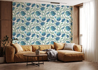 An intricate trailing Indian Floral print in Blue and White as main colors and gray and green as supportive colors. This vintage and arts and crafts inspired pattern is for heritage revival aesthetics. Embrace the serene beauty of our "Trailing Indina Floral - Blue and White" wall décor. This design features an intricate dance of stylized flora, inspired by classic Indian motifs. A soothing palette of deep blues and crisp whites creates a visually captivating statement, perfect for adding a touch of elegance and tranquility to any room. The trailing vines, adorned with uniquely patterned leaves, weave across a subtly textured backdrop, evoking a sense of organic growth and timeless charm. Transform your space with the refined aesthetic of this floral masterpiece. Let its tranquil color palette and artistic design breathe life into your walls.