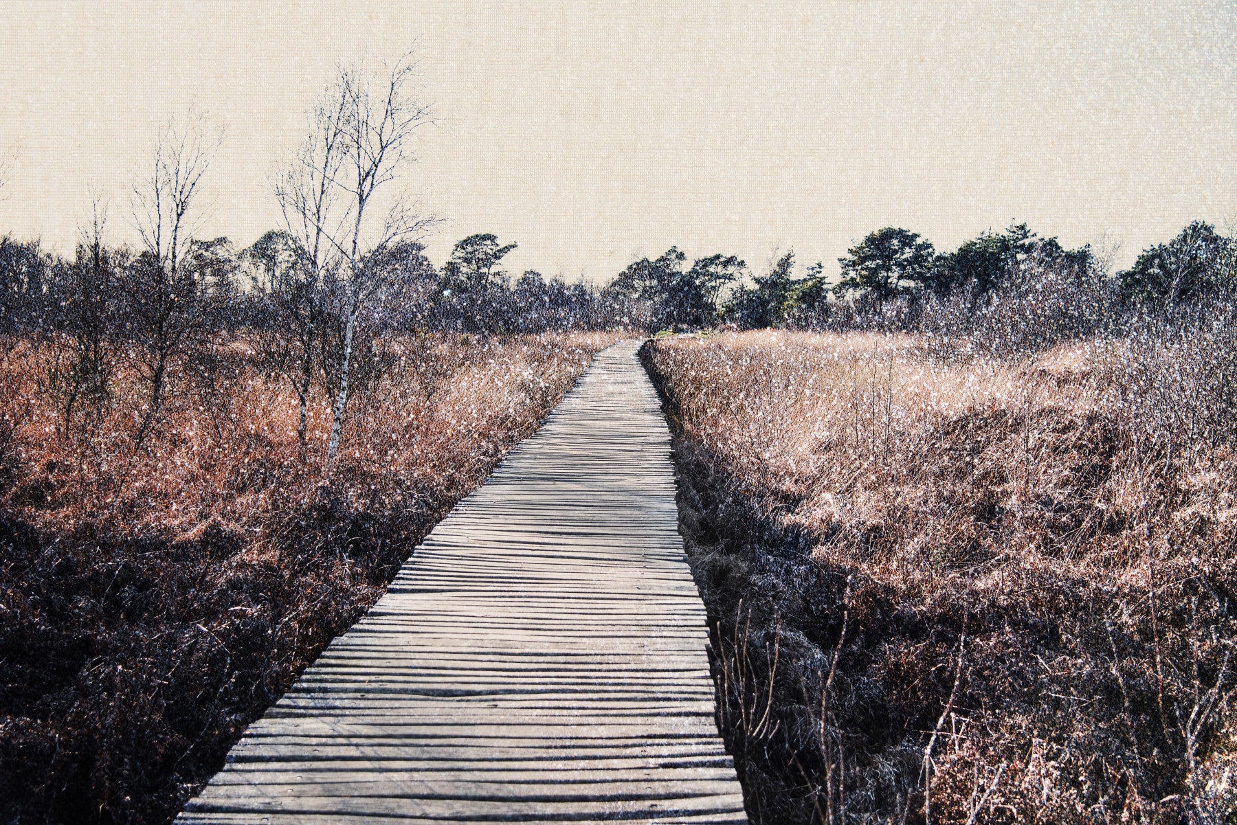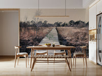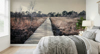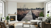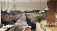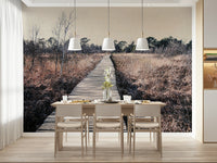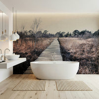 Bring the outdoors inside with this tranquil landscape. The wooden path draws the eye through muted browns and natural tones, creating a sense of calm. Imagine this serene scene as wallpaper for walls in a study or bedroom. The design complements minimalist interiors, adding texture and depth while maintaining a relaxing atmosphere. Consider this for a cozy reading nook, an office, or any space where peace and quiet are valued. The subtle palette invites you to unwind and reconnect with the stillness of nature.