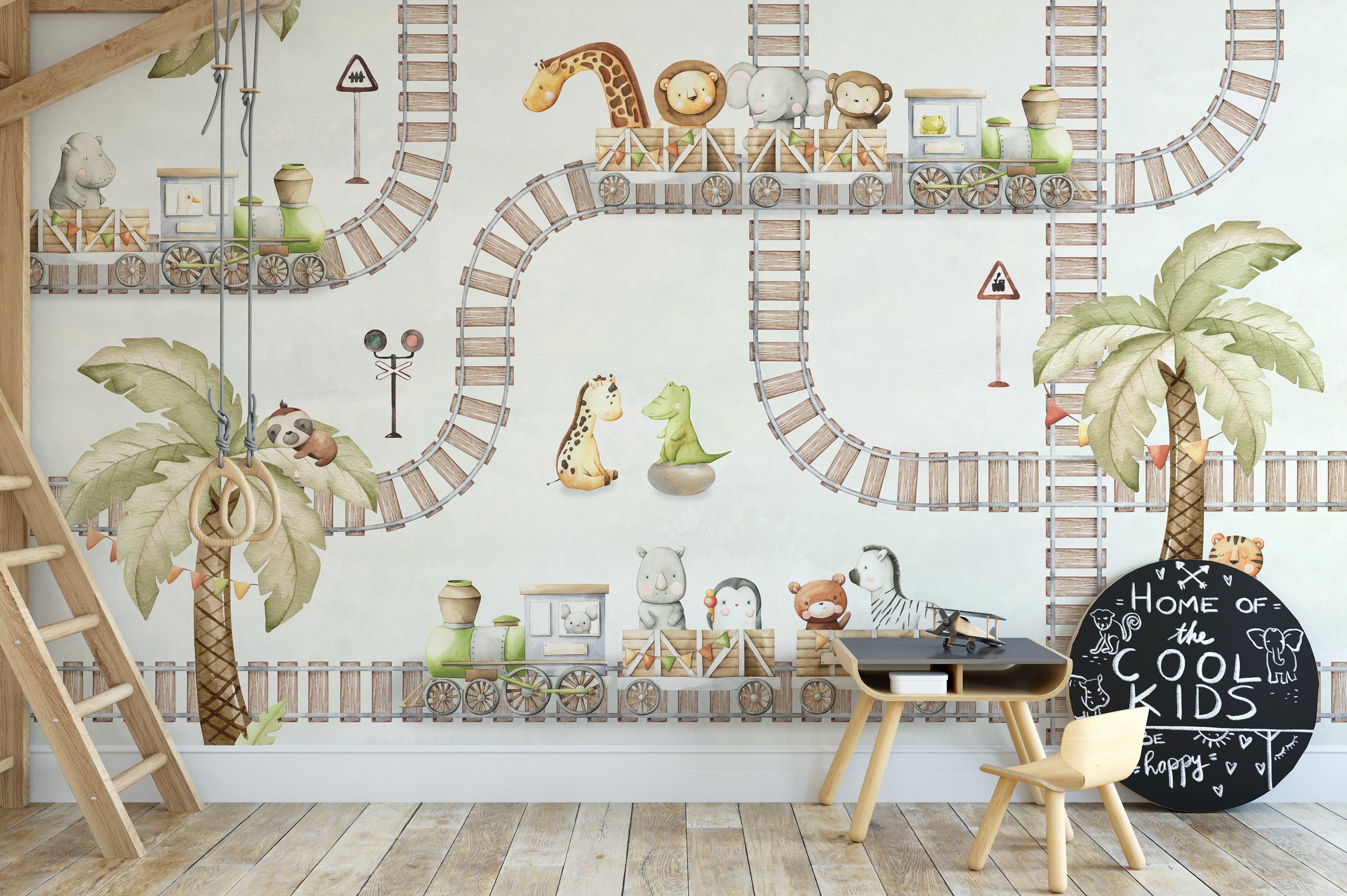 Experience the joy of a magical journey with the train travels kids room wallpaper mural. This enchanting design features a playful train ride filled with adorable animals, weaving through lush landscapes and whimsical scenes. Perfect for sparking imagination, this mural turns any room into a captivating adventure land. Children will love the charming characters and the delightful scenery, making their space a place of endless fun and creativity. Let your little one's room come alive with this unique and engaging wallpaper mural, ideal for nurseries, playrooms, and kids room. Limited Time Offer: Transform your little one space with our stunning wallpaper mural!