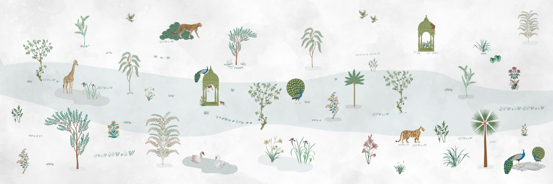 Create a peaceful retreat with this detailed wallpaper for walls, a beautiful botanical print showcasing animals within a stylized landscape. The design blends soft colors with intricate illustrations, bringing a hint of the exotic to your space. Consider this wallpaper for a calming bedroom or a sophisticated living room. This pattern complements interiors that lean towards classic or contemporary styles, adding an element of botanical charm. This design infuses a home with a sense of tranquility and natural beauty.