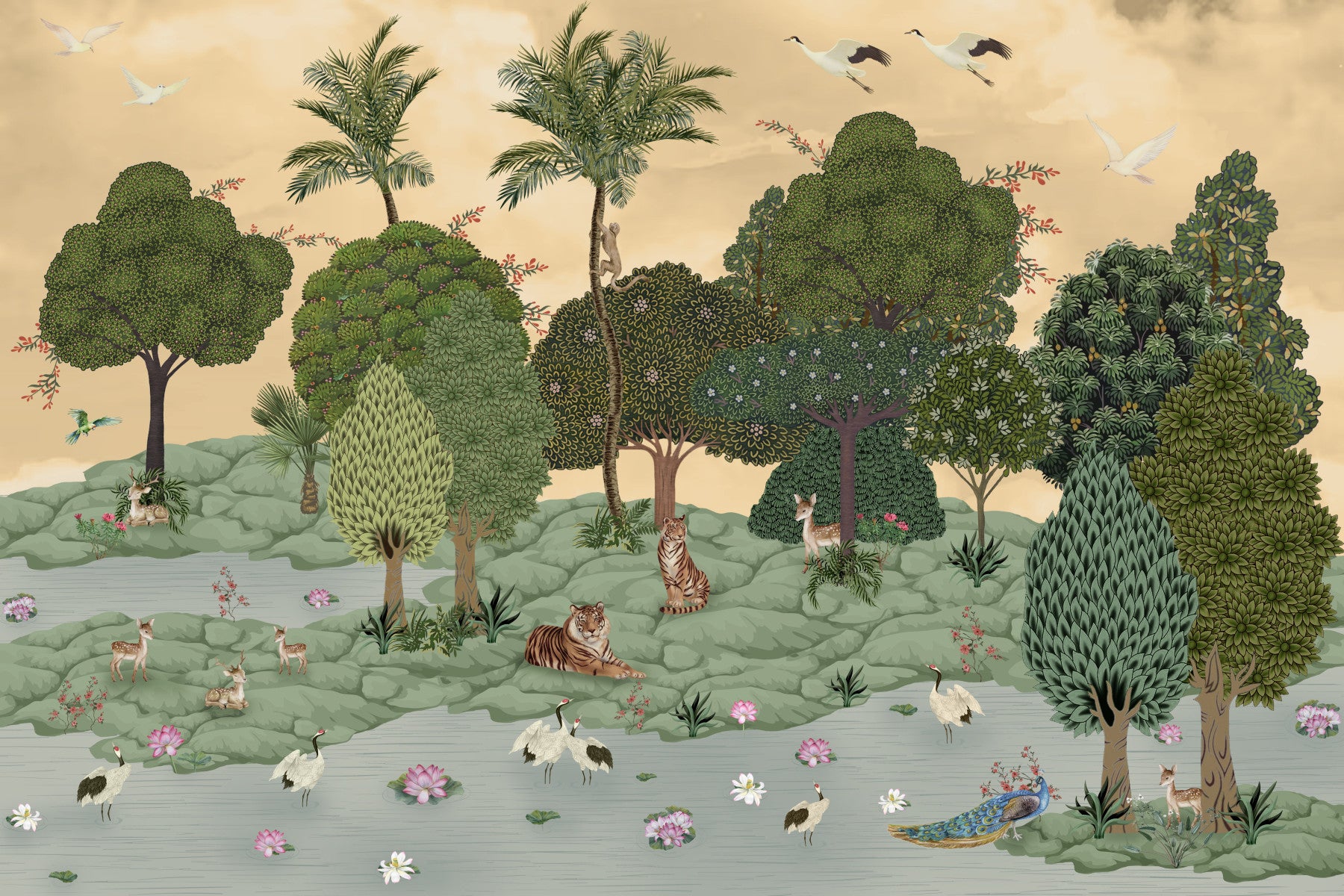 Invite serenity into your home with this enchanting wallpaper for walls. The design presents a peaceful landscape featuring tigers, deer, and birds amidst lush greenery and tranquil waters. Soft beige tones create a warm backdrop, while the varied greens add depth. This wallpaper complements living rooms, bedrooms, or nurseries, bringing a touch of nature's calm and artistic flair to your interior spaces. Imagine the calming effect it will bring to your room.