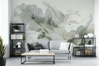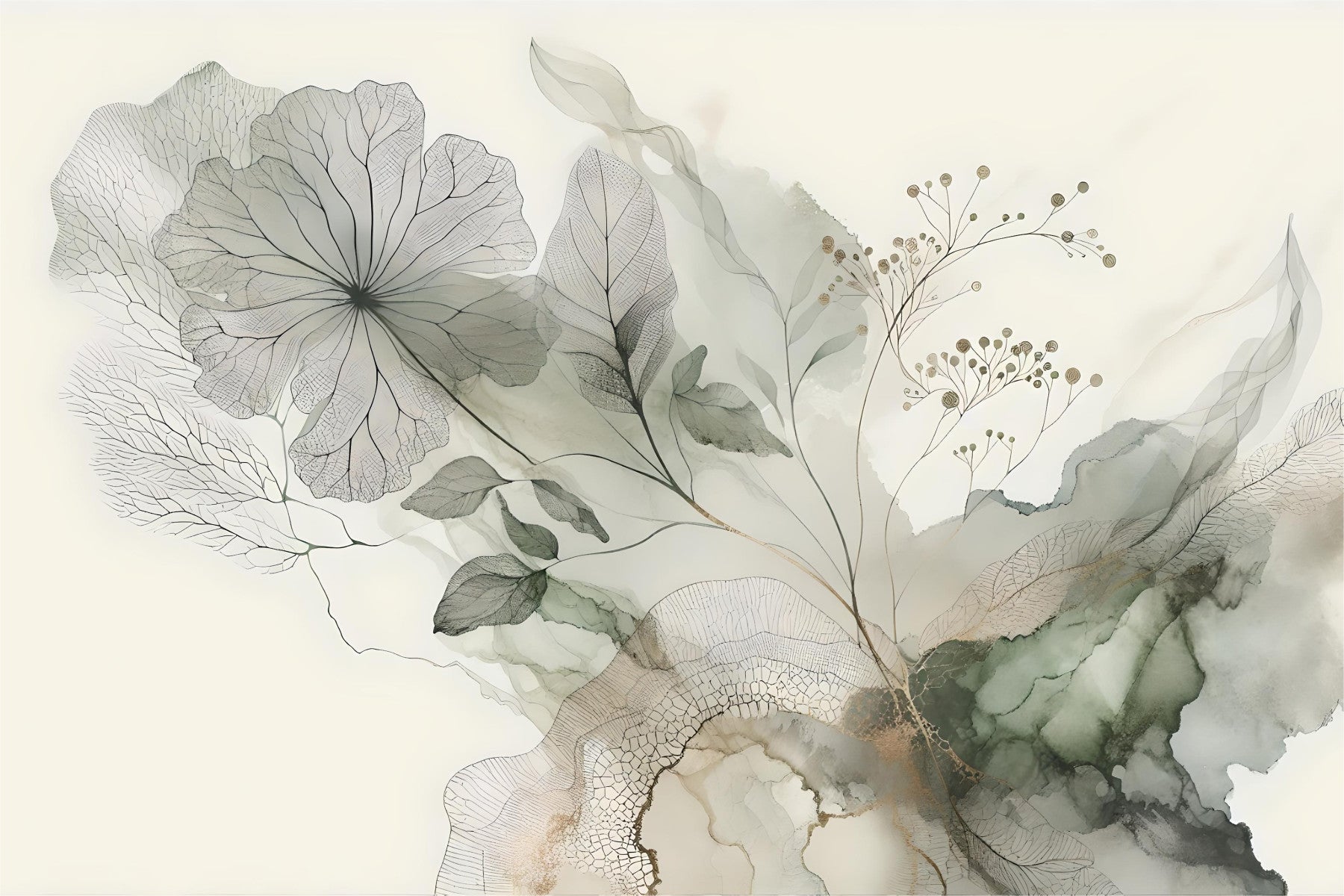 This wallpaper evokes a sense of serene tranquility through its ethereal depiction of botanical elements. Delicate, skeletal leaves and flowers are rendered in a grayscale palette, overlaid with soft sage green and blush pink watercolor washes. Gold accents add a touch of subtle luxury, while the overall aesthetic remains minimalist and calming, making it ideal for creating a peaceful and sophisticated atmosphere in any room. The interplay of linework and color creates a visually engaging and harmonious design, perfect for those seeking a sophisticated yet calming backdrop for their space.