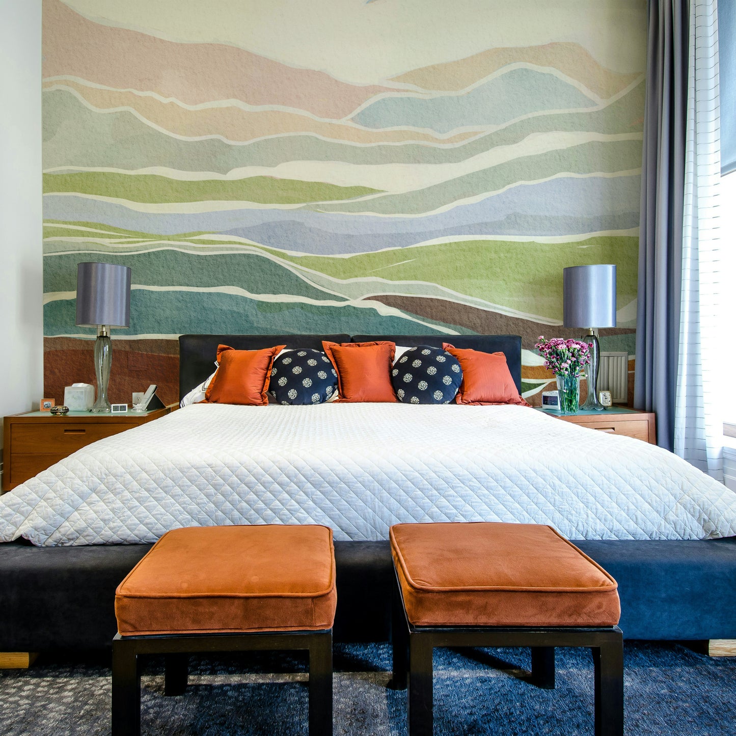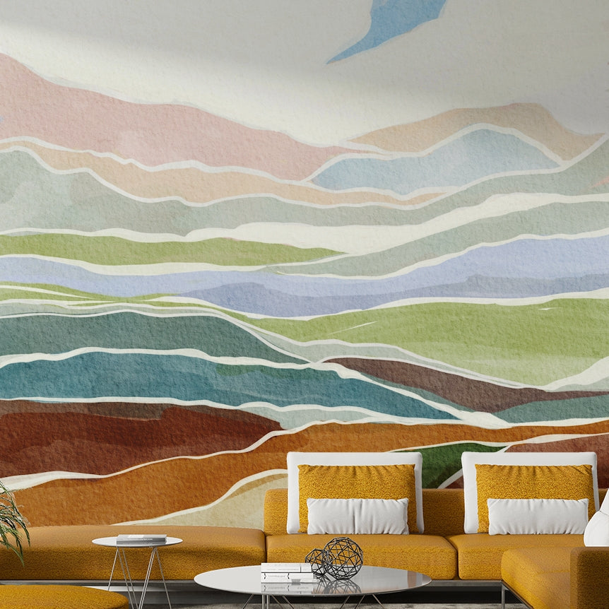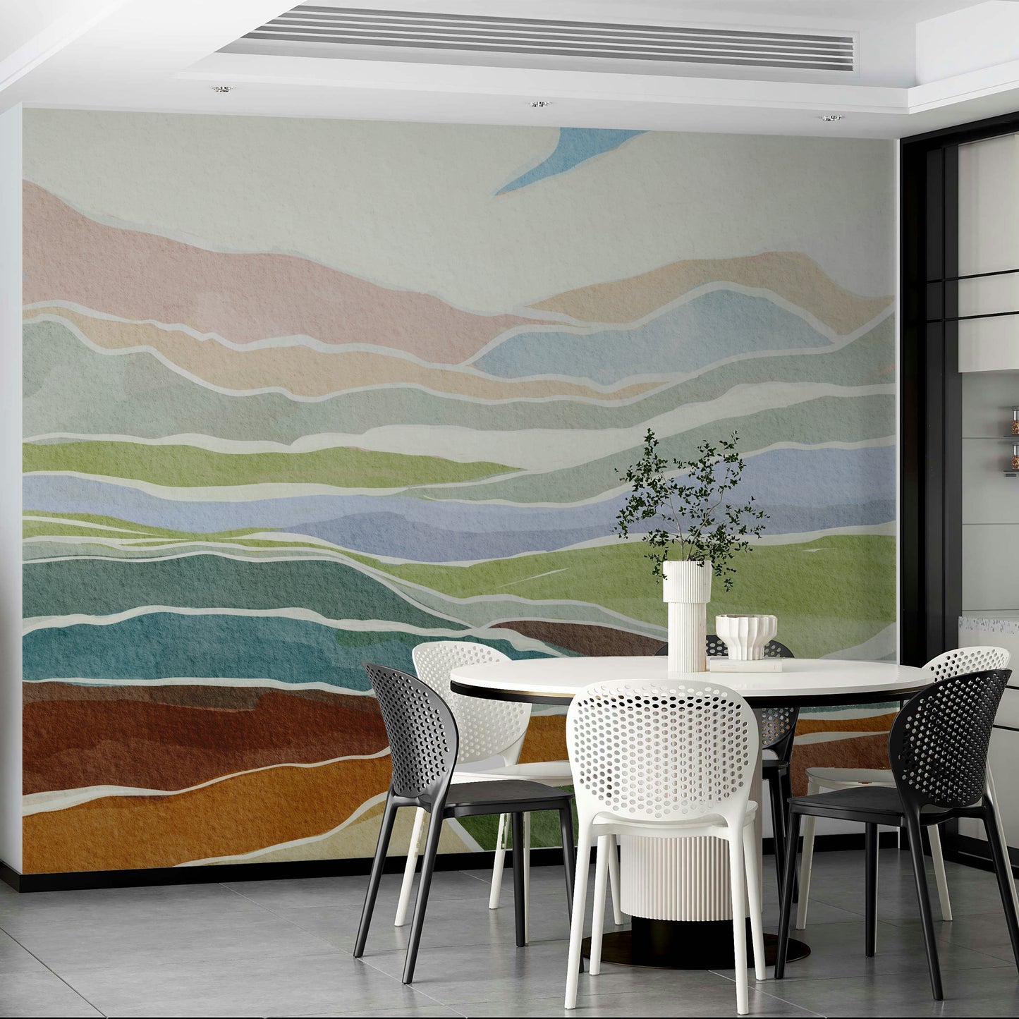 This wallpaper presents a breathtaking abstract watercolor interpretation of rolling hills. The soft, pastel palette featuring blues, greens, and browns creates a tranquil and inviting atmosphere. The flowing lines and gentle curves suggest a peaceful and dreamy setting. Perfect for bedrooms, living rooms, or any space where you want to promote relaxation and a sense of calm, this wallpaper offers a sophisticated and artistic touch to your home decor. The subtle detail and calming colors make it a timeless addition to any interior.