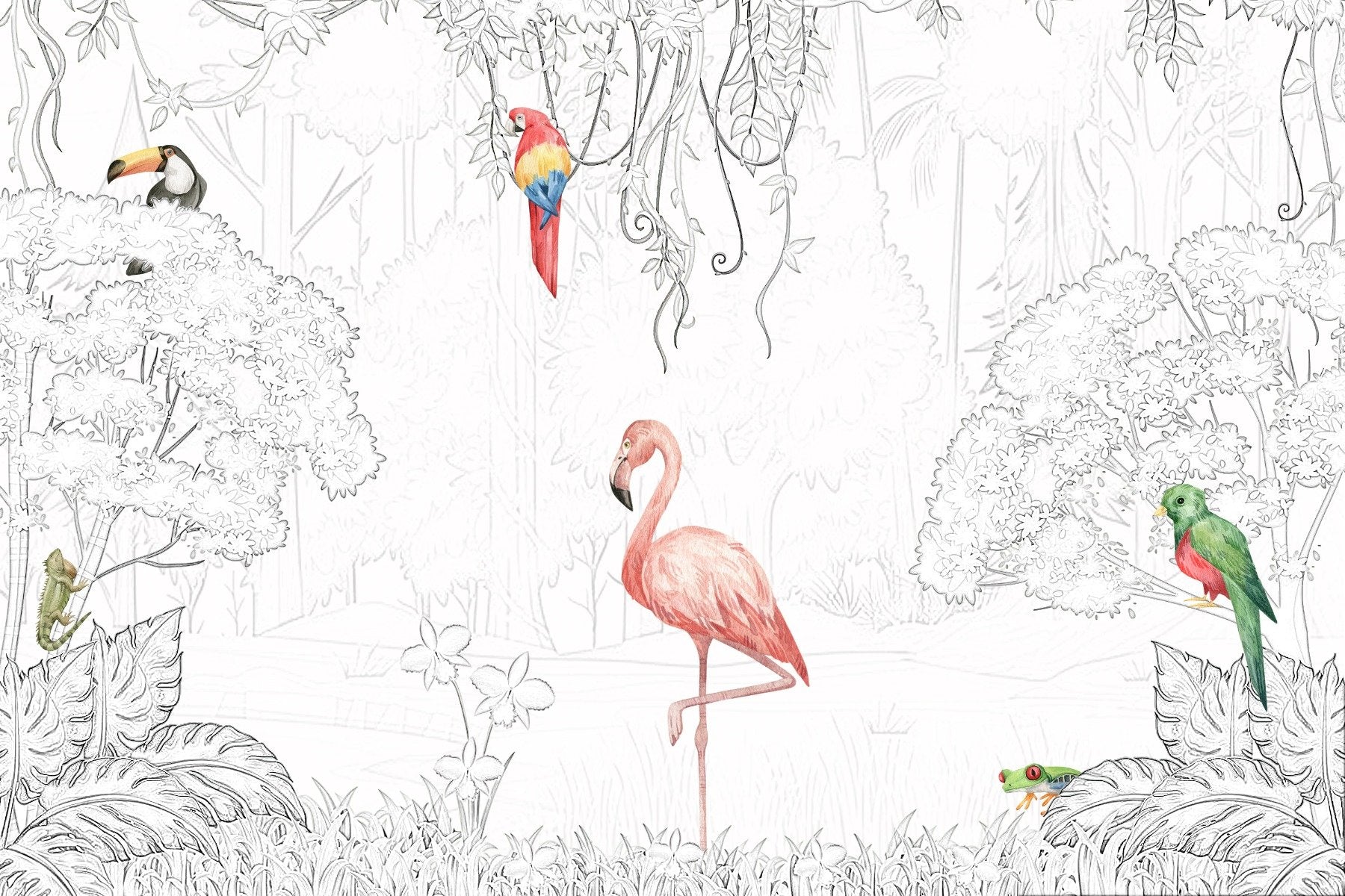 This mural celebrates the beauty and vibrancy of the tropics, inviting the spirit of the rainforest into your home with a touch of artistic whimsy. Each bird, from the elegant flamingo to the playful parrot, is depicted in a burst of color that stands out against the monochrome background, creating a stunning visual impact.
