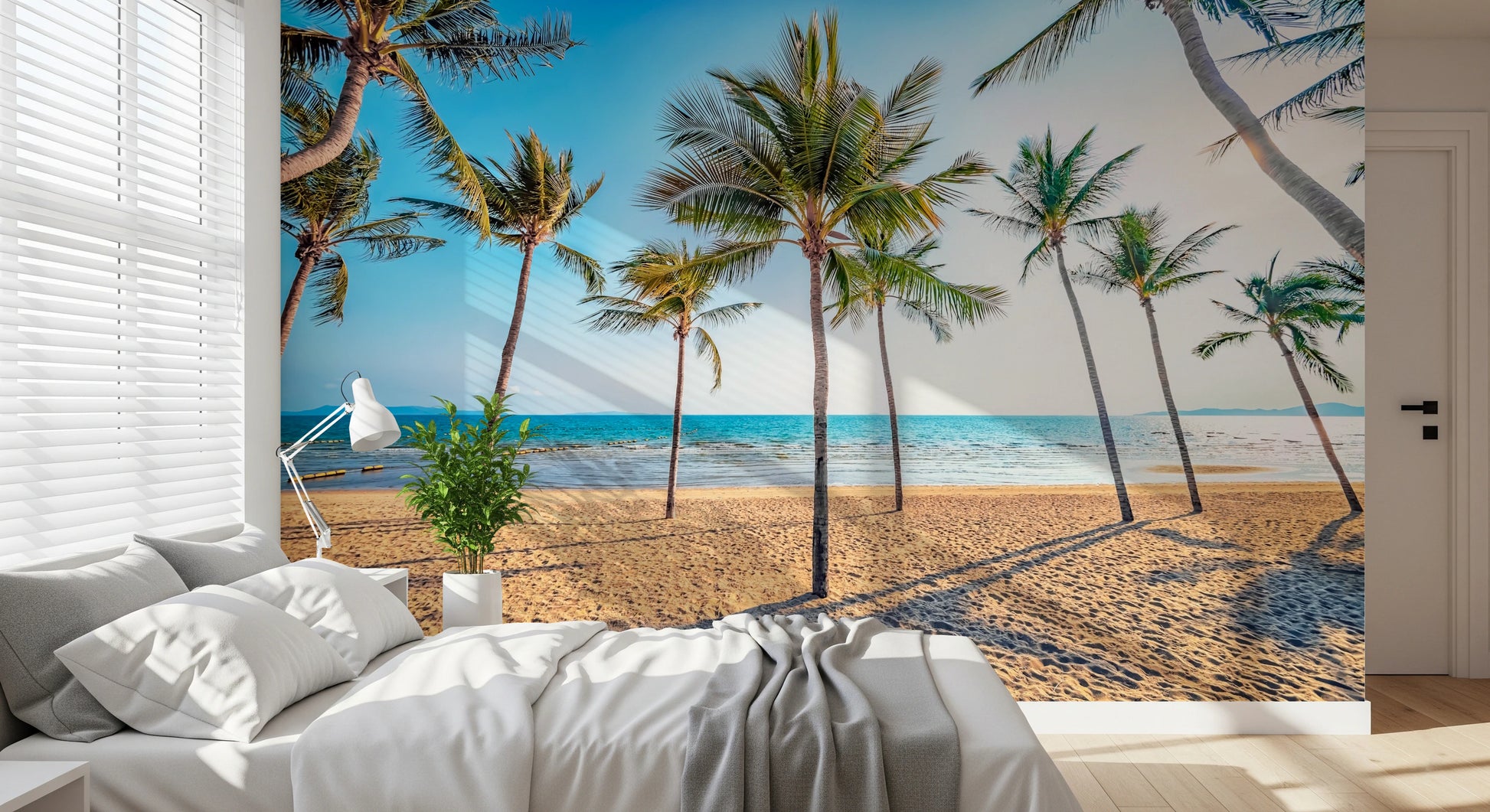 Transform your living space with this serene tropical beach scene. The design features lush palm trees reaching towards a clear blue sky, above a golden sandy beach and turquoise sea. This wallpaper for walls brings a calming and relaxing atmosphere to any room, creating a tranquil escape. The subtle gradient of colors adds depth and visual interest. Ideal for bedrooms, living rooms, or even bathrooms, this wall covering evokes a sense of peaceful escape. Let this beautiful beach view enhance your interior with a touch of tropical paradise, making your home feel like a vacation getaway.