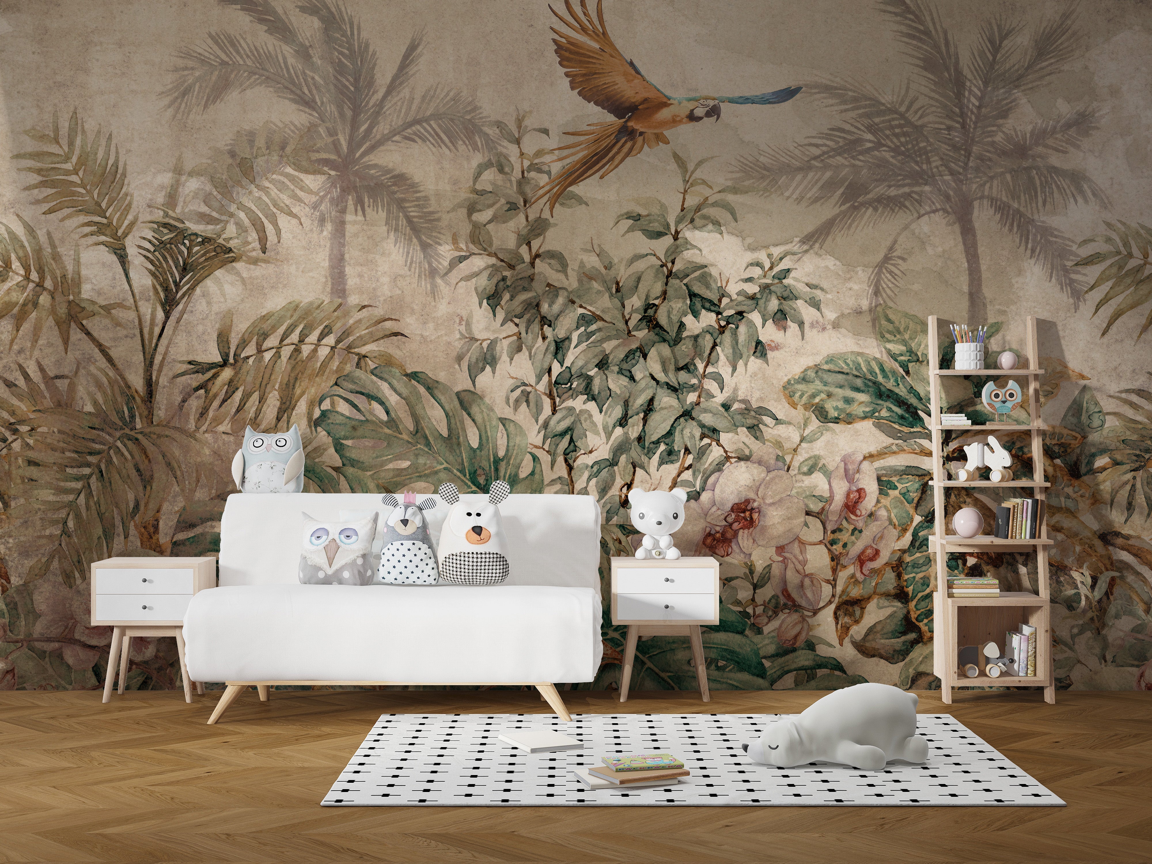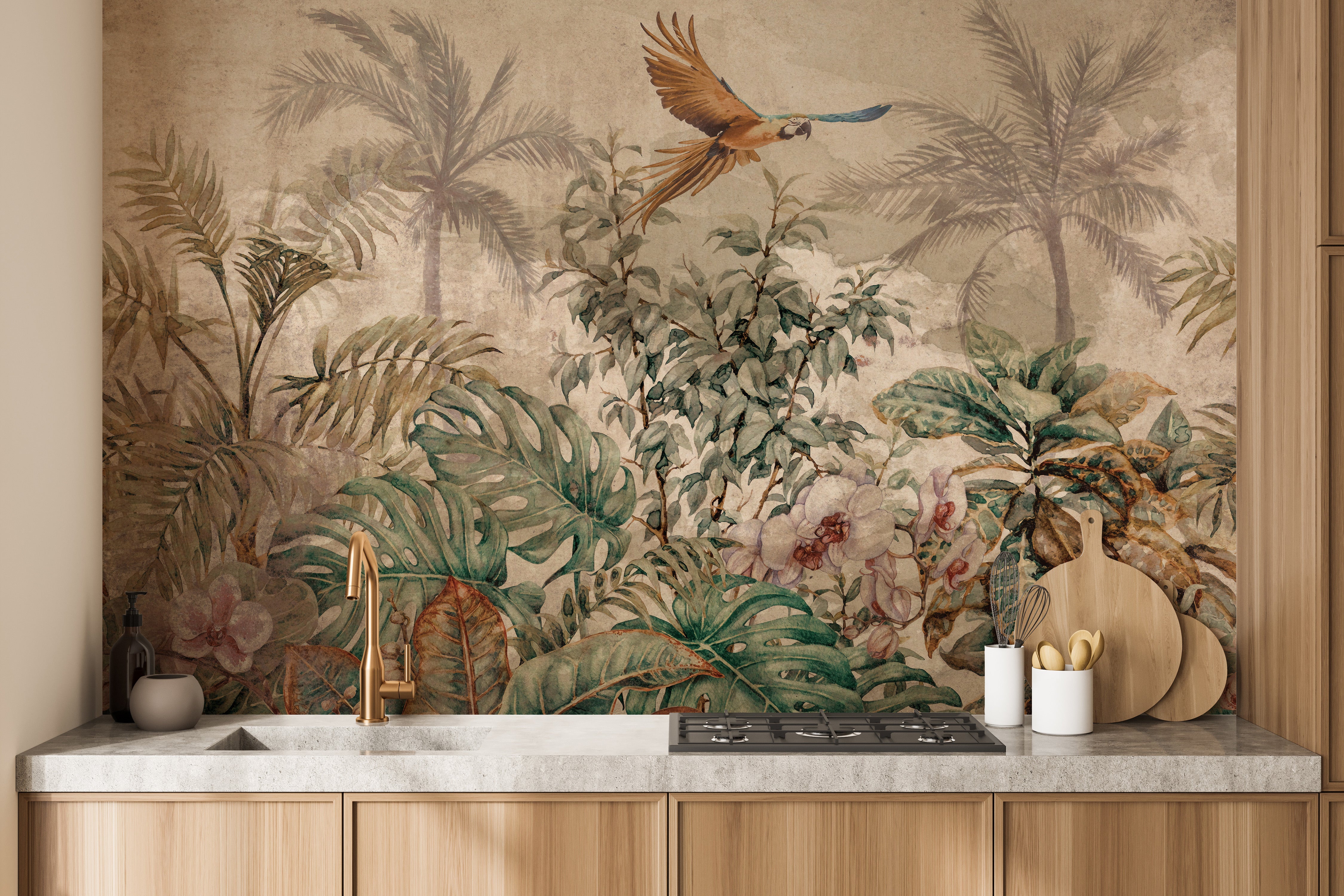 Bring the serene ambiance of a tropical haven into your home with our sepia-colored tropical forest wallpaper murals. Crafted to infuse your living environment with an invigorating warmth, this exquisite sepia tropical wallpaper sets a mood that energizes your mornings and soothes your evenings. The sepia tones offer a vintage charm, blending effortlessly with any interior, while the lush tropical forest imagery promises a dynamic backdrop that captivates and impresses.