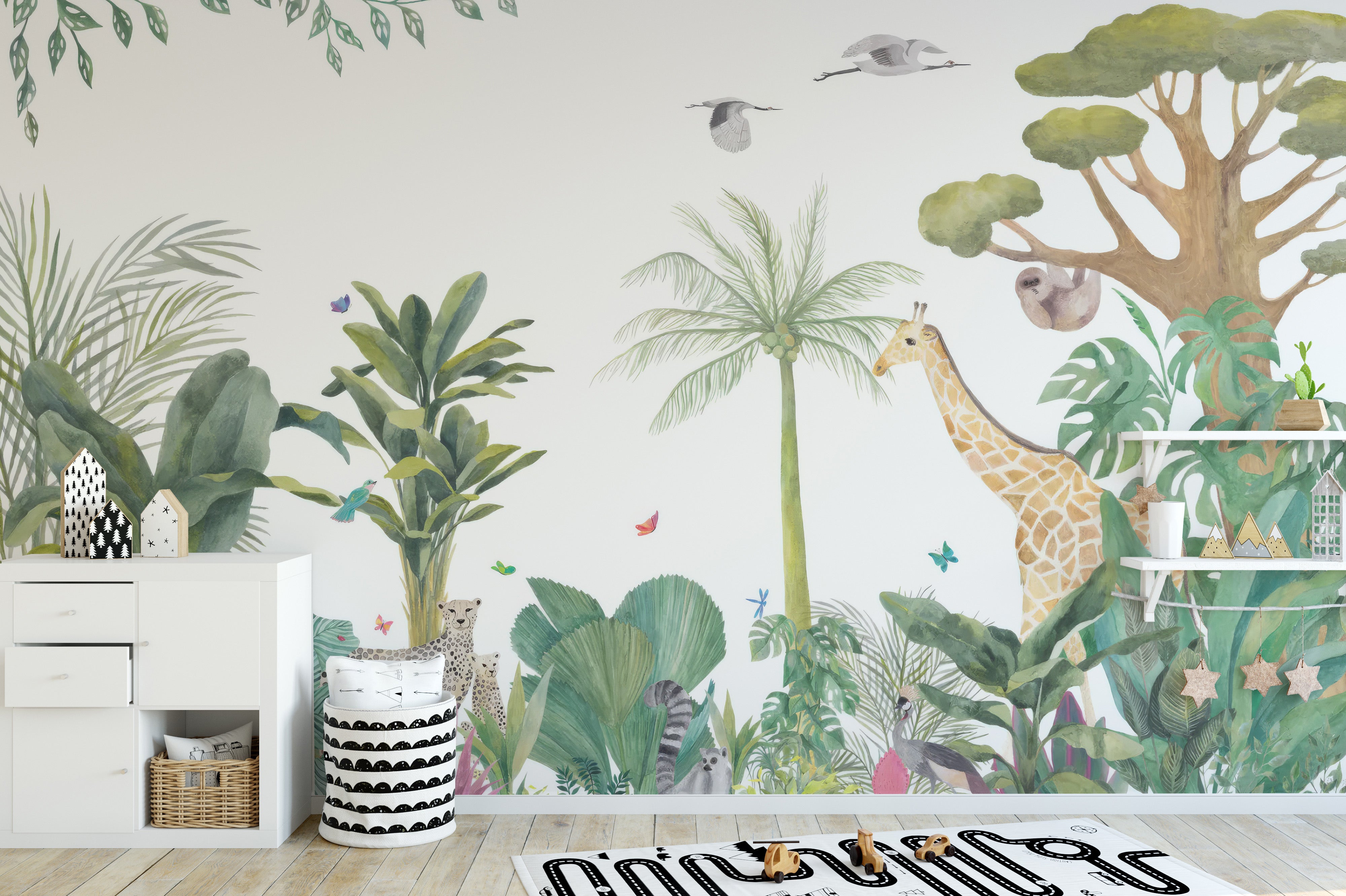 Bring a burst of life to your nursery with the tropical forest wall mural, perfect for sparking imagination and wonder in your child's room. Each panel is a window into a vibrant jungle, where giraffes reach for sky-high trees and leopards prowl through lush foliage. The detailed illustrations invite eyes to explore, creating a playful yet calming environment for young minds. Our nursery wallpaper is crafted for easy application, ensuring a smooth journey to a captivating nursery scene. The colors are carefully chosen to complement a wide range of nursery themes, making this mural a versatile choice for parents looking to create a special place for their little ones.