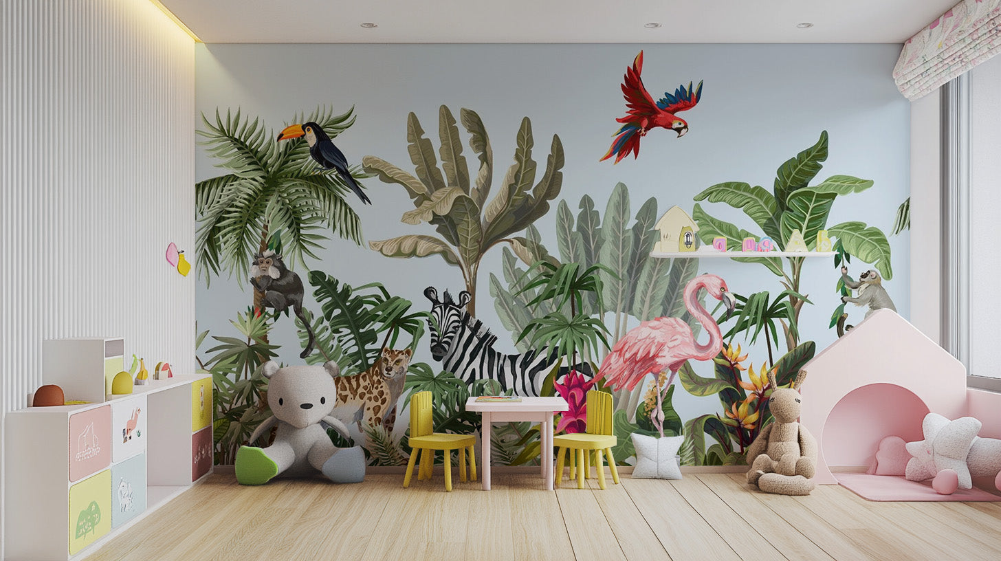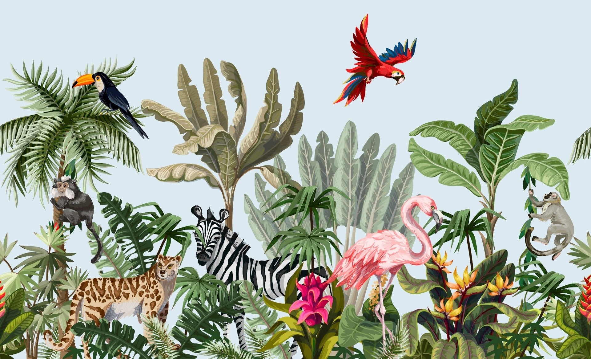 Fuel your kid's imagination with this amazing tropical forest, animals, and birds wallpaper mural. Teeming with colorful birds like macaws, flamingos, and toucans and wild beasts like cheetahs, zebras, and monkeys against the dense foliage of tropical trees. The sky-blue backdrop provides the perfect setting for a striking contrast and amplifies the motifs to the fullest. Be sure to find your kids smiling gleefully as this decal adorns their walls. Complement it with modern, playful furniture to up the look.