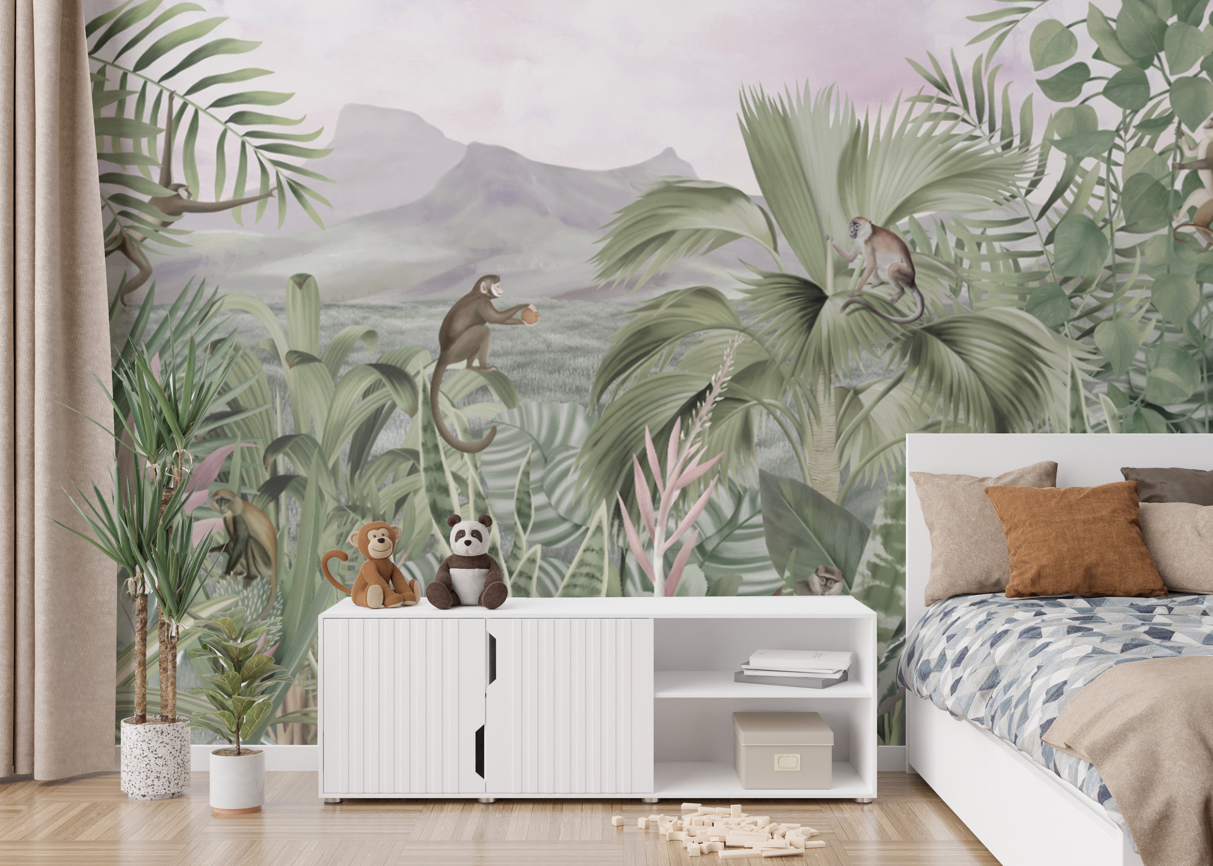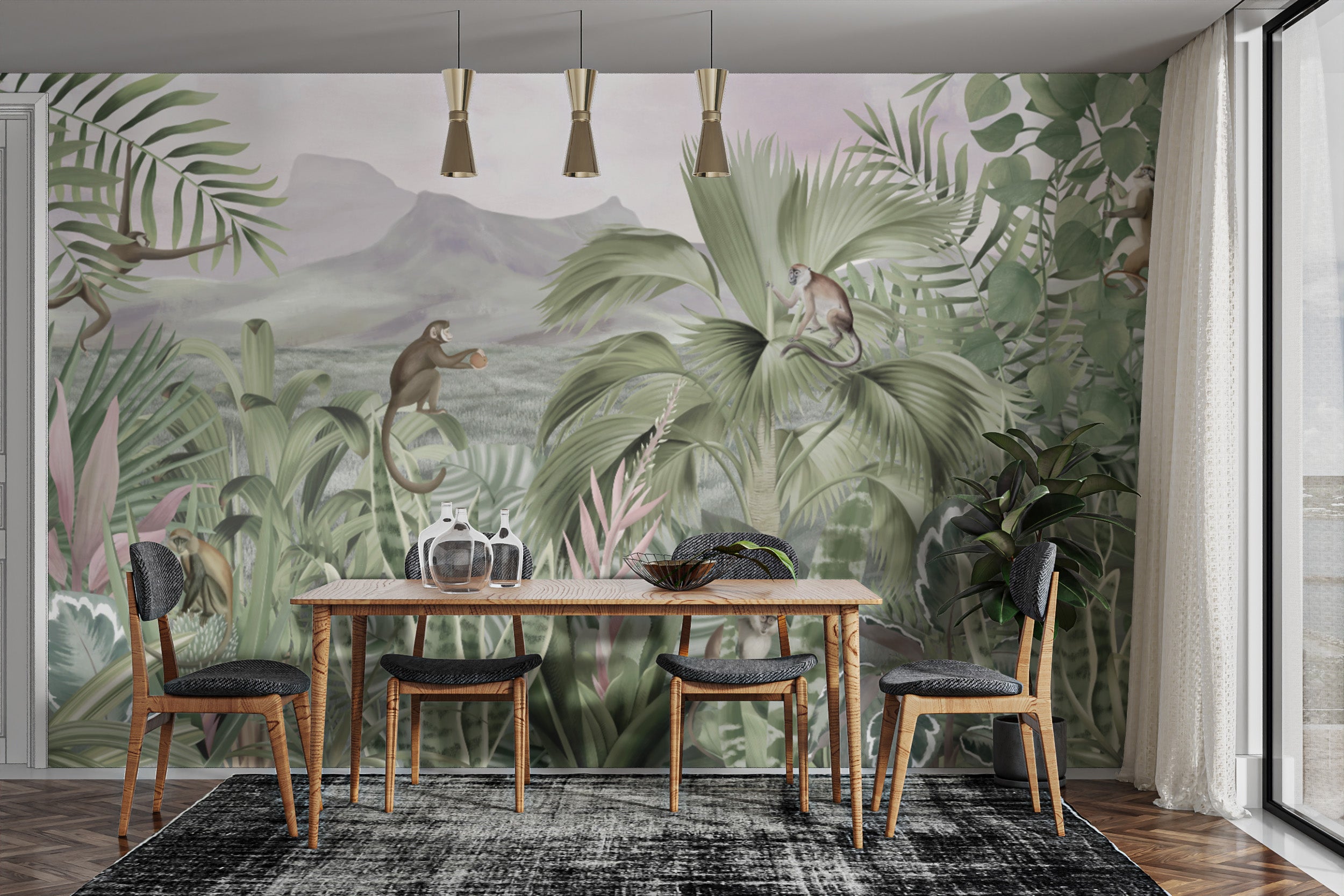 Transform your room into a jungle of greenery with the Tropical Monkey Jungle Wallpaper Mural. This richly rendered design has the charm of whimsical monkeys in an array of splendidly colored leaves of tropical green palm leaves and the peace of the jungle beyond. Its [best for children's rooms, nurseries, or nature-themed decor], this exotic tropical jungle wallpaper offers both an aura of adventure and serenity. Made of high-quality materials, it is therefore durable and easy to apply. Uplift your interior design with this botanical jungle mural, ideally suited to bring out a nature-inspired atmosphere. Used in a home or an office, this rainforest mural brings the relaxing effect of nature to any room. Peel-and-stick options are available!
