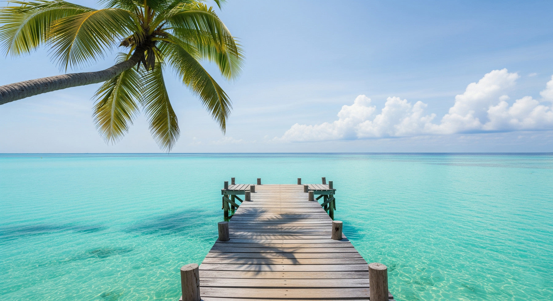Escape to paradise with this soothing wallpaper for walls. The image captures a wooden pier stretching out into crystal-clear turquoise waters, shaded by a leaning palm tree against a gentle blue sky. The serene color palette and simple composition bring a sense of calm to any room. It is ideal for bathrooms, bedrooms, or living rooms, the design adds a touch of tropical tranquility, instantly refreshing your space and creating a peaceful oasis within your home. Let this scene transform your interior.