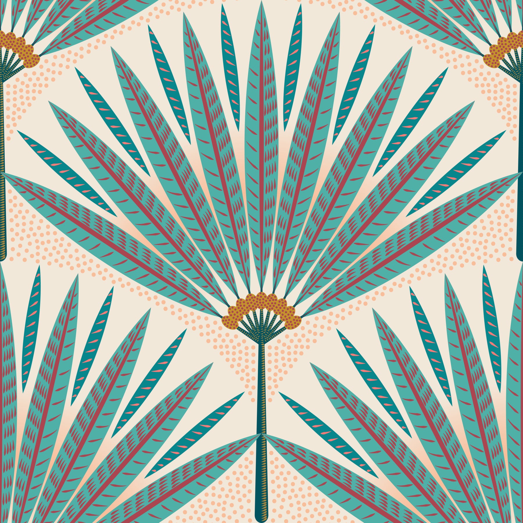 Immerse yourself in a vibrant tropical escape with this wallpaper. The design features stylized teal and burgundy palm leaves arranged in a symmetrical, almost art deco pattern, creating a sense of calm yet energetic sophistication. The subtle peachy-beige background adds a soft touch, while the dotted texture provides a playful contrast. This wallpaper is perfect for adding a touch of exotic elegance to any room in your home, from the living room to a tranquil bedroom.
