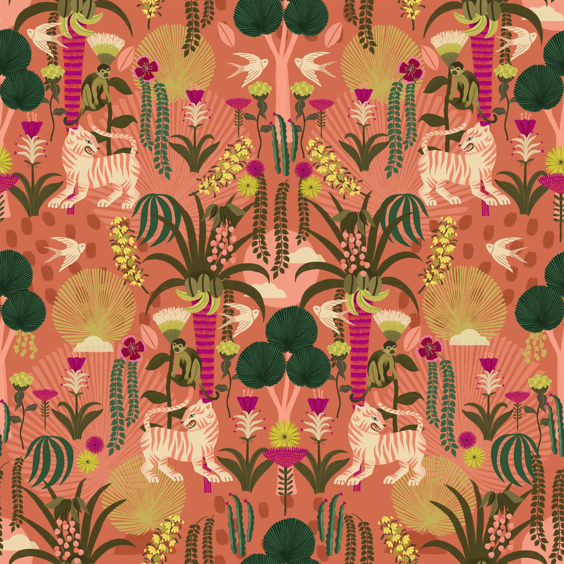 Escape to a vibrant paradise with "Tropical Tiger Garden." This wallpaper transports you to a lush, stylized jungle brimming with life. Striking orange tigers gracefully roam amidst a profusion of exotic flowers in bold hues of pink, purple, and yellow. Playful monkeys swing from vibrant, banana-laden palm trees, while delicate birds flit between the foliage. The overall design is a sophisticated blend of organic and geometric shapes, creating a captivating and harmonious scene that is both playful and elegant. Perfect for adding a touch of wild sophistication to any space.