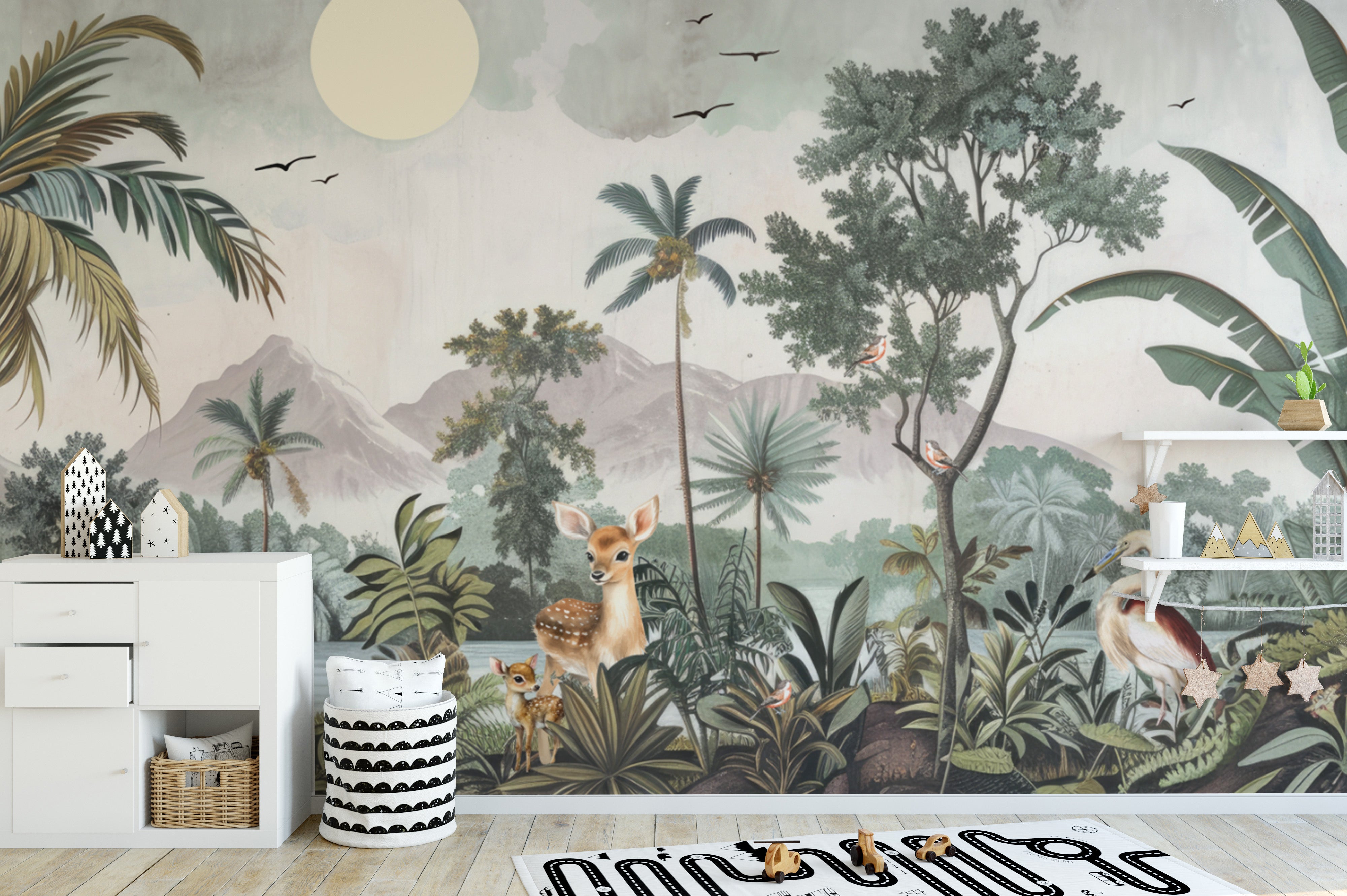 Create a lush and vibrant atmosphere with the tropical wildlife forest wallpaper mural. Featuring dense greenery, exotic birds, and gentle deer, this design brings the beauty of a natural sanctuary indoors. Towering palm trees, rich foliage, and misty mountains enhance the scene, while soft hues create a calming effect. The detailed hand-painted style blends vintage charm with modern elegance. Ideal for bedrooms, living rooms, and offices, this tropical jungle wallpaper mural adds depth and character to any setting. High-quality materials ensure durability and a flawless finish. Refresh interiors with the essence of a serene forest wildlife wallpaper experience.