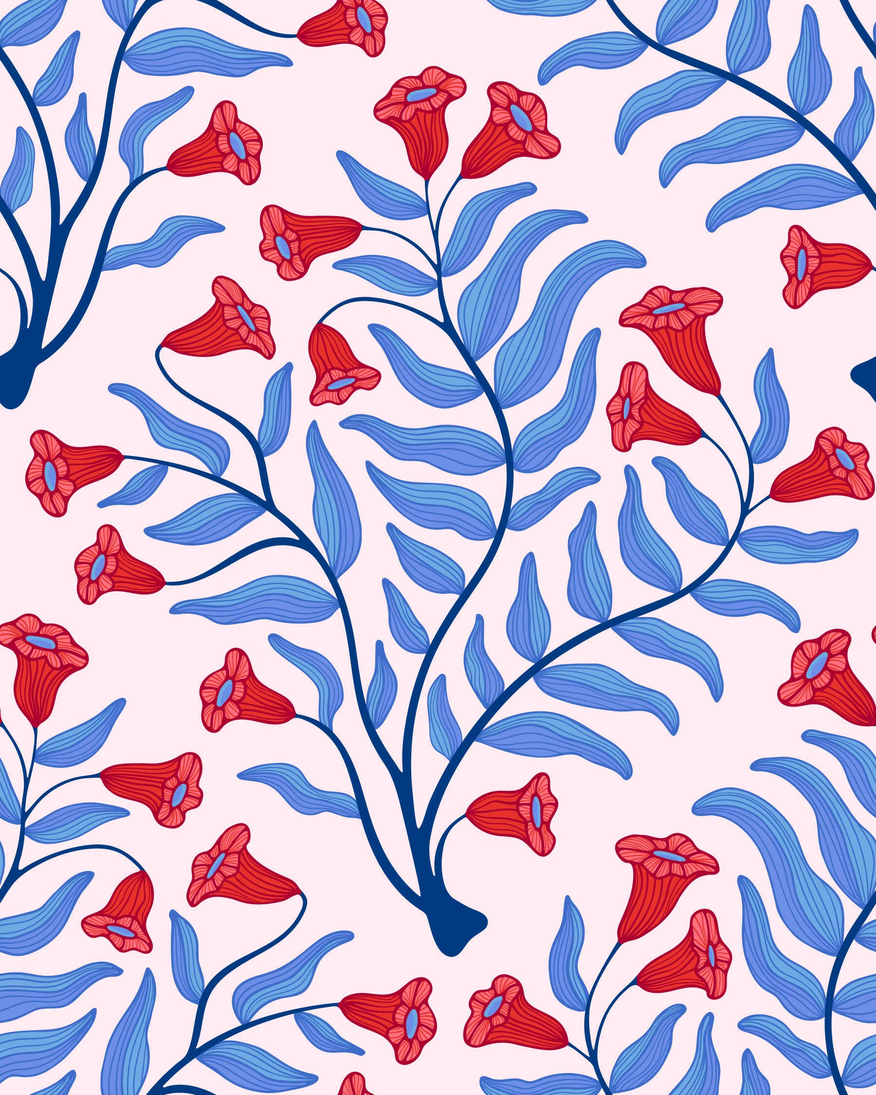 Evoke a vintage botanical charm with this captivating trumpet flower damask wallpaper. The cool blue leaves provide a striking contrast to the vibrant red and light pink trumpet flowers, creating a visually stunning and harmonious design. This detailed floral pattern combines classic damask elements with a fresh, modern botanical twist, perfect for adding a touch of elegance and color to any space. Its blend of vintage sophistication and contemporary color palettes makes it an ideal backdrop for creating a serene and stylish atmosphere.