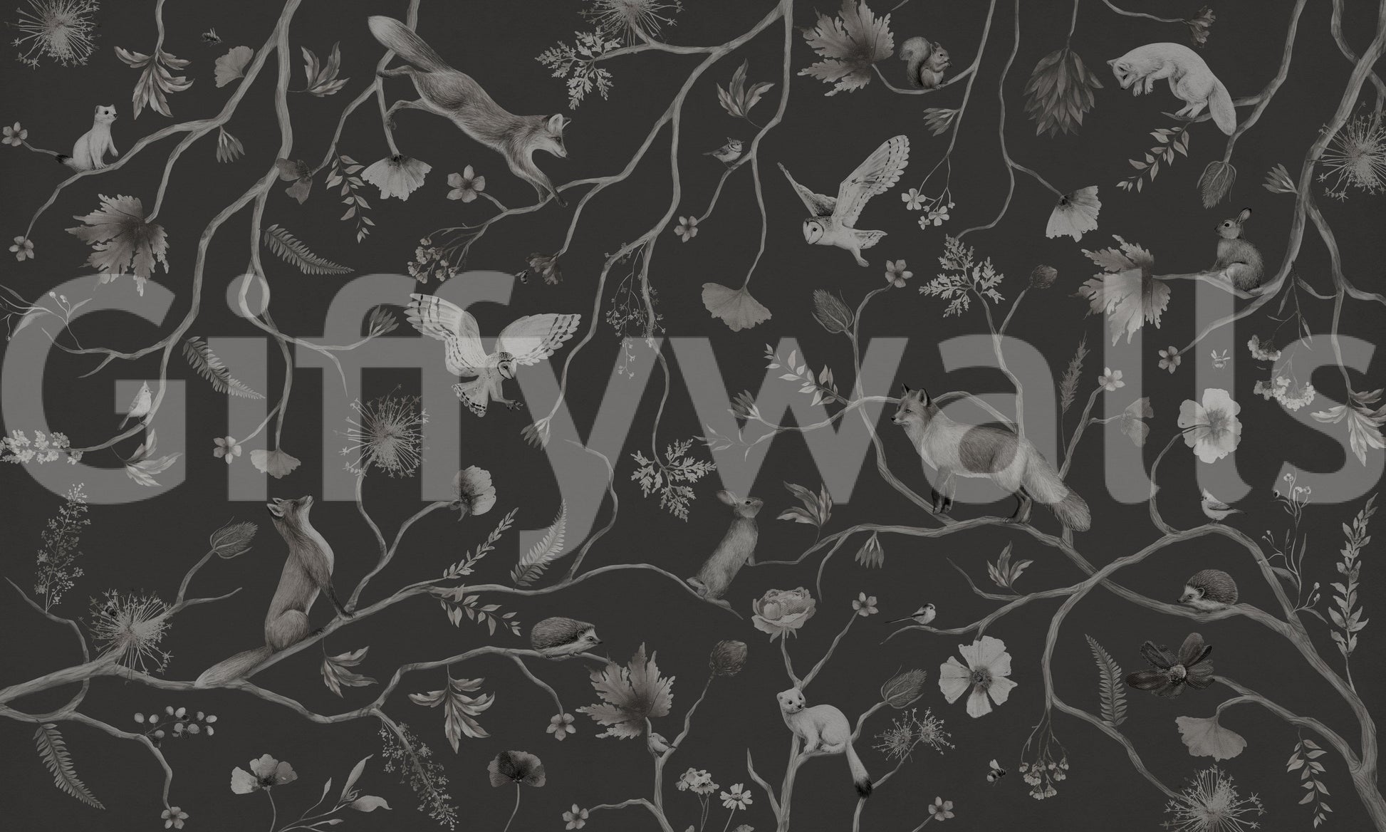 Transform your space with this unique wallpaper. The intricate grayscale design depicts woodland animals gracefully positioned on branches and among delicate flowers and leaves, creating a serene and sophisticated atmosphere. This distinctive wallpaper for walls blends seamlessly with various décor styles. It is perfect for a relaxing bedroom, or an elegant living room, introducing an artistic expression of nature into your home. This design brings a calming essence to interiors seeking understated charm.