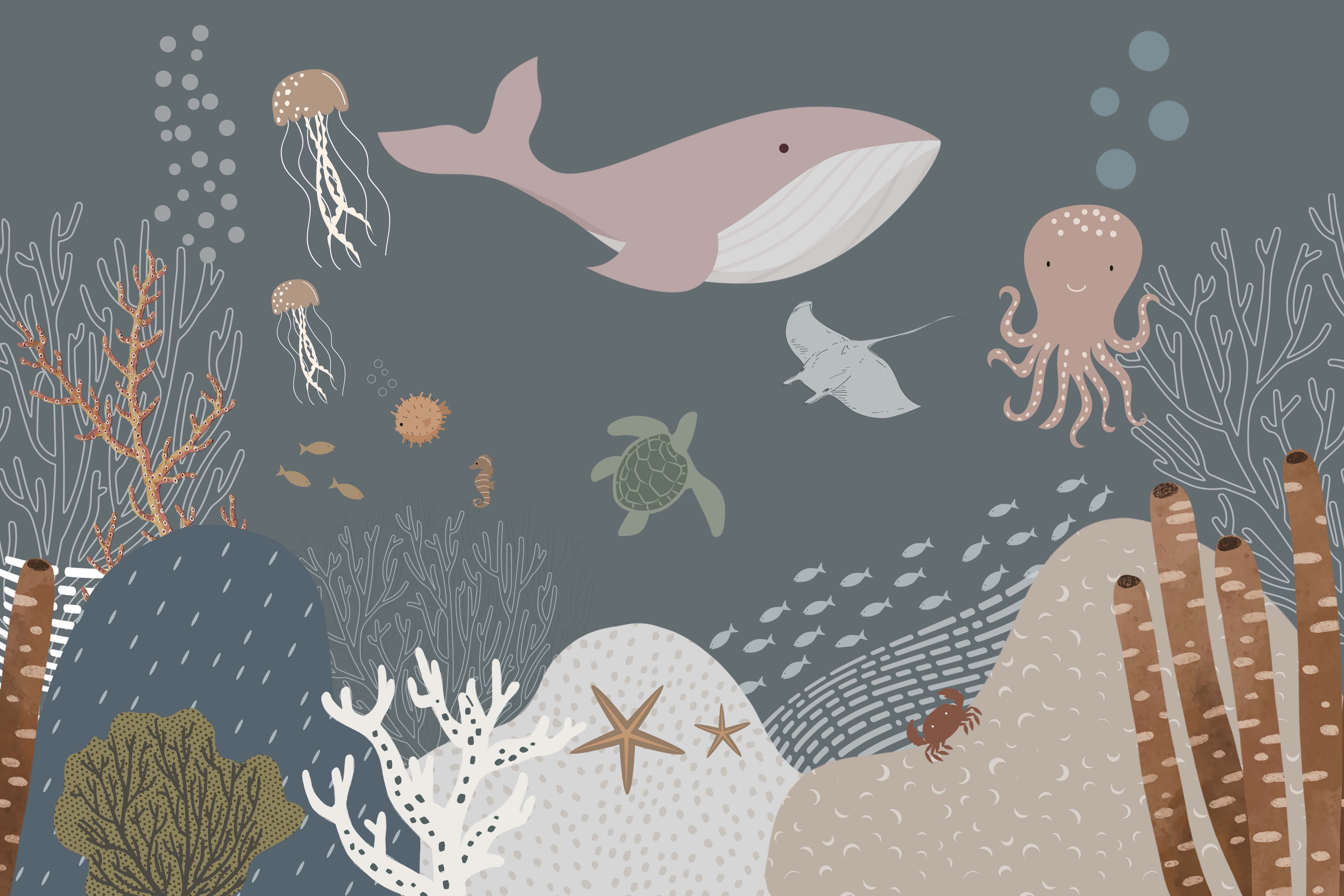 Dive into a mesmerizing underwater realm with our underwater aqua animated wallpaper murals. This exquisite wall decor piece brings the ocean's serenity and mystery to your space, as it comes alive with gracefully gliding whales, playful octopuses, and ethereal jellyfish. The mural's soothing palette of grays and whites seamlessly adapts to various settings, making it a delightful addition to a living room seeking a splash of fun or a child's nursery where imagination can run wild.