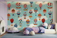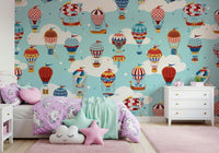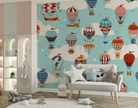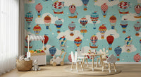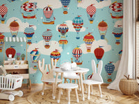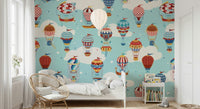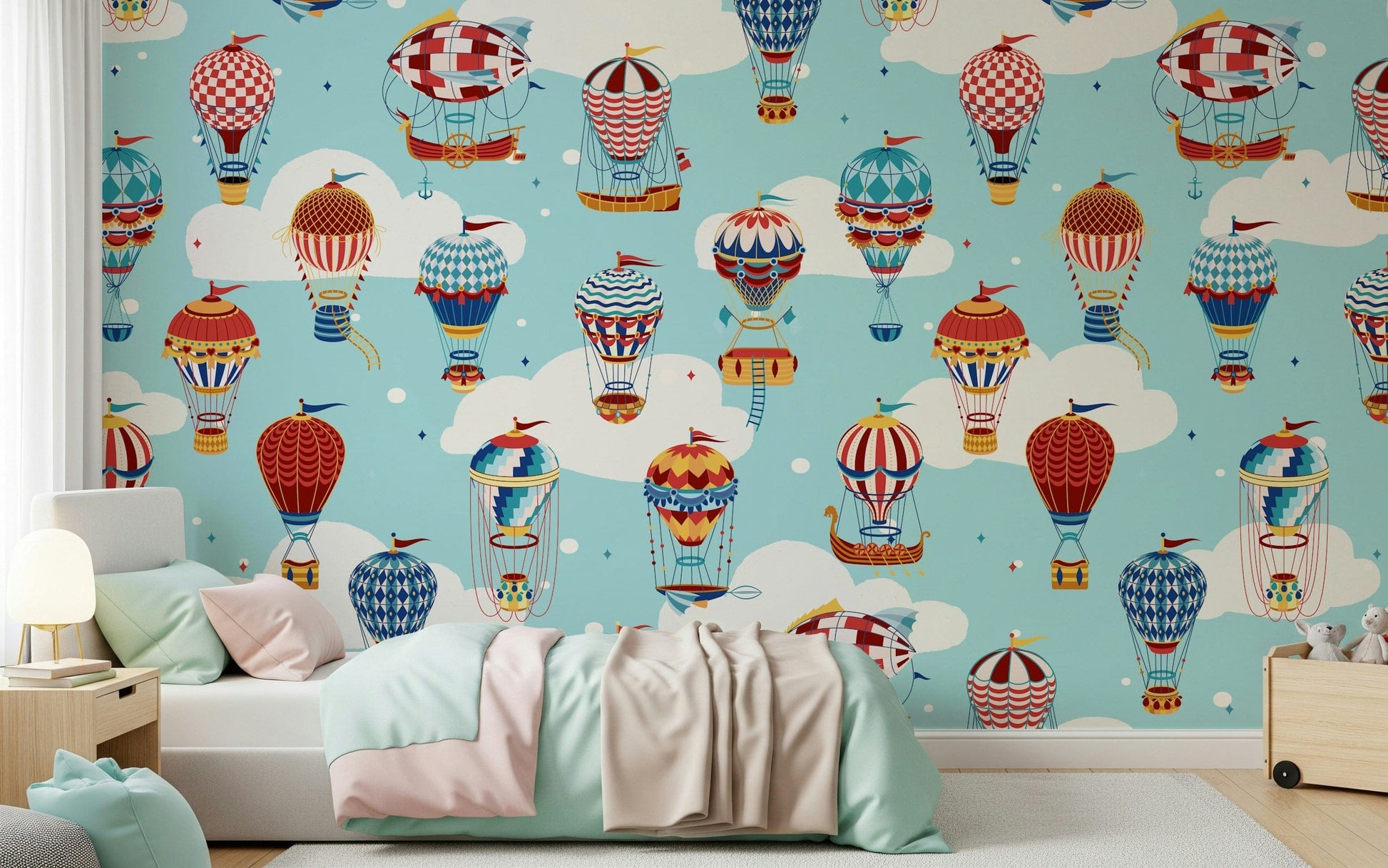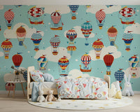 Let your imagination soar with this whimsical wallpaper for walls! A playful pattern of colorful hot air balloons floats against a sky of soft, white clouds. This design uses shades of red, blue, and yellow to bring an uplifting feel to any space. Perfect for a kids room, nursery, or playroom, this vibrant wallpaper creates a cheerful and inviting atmosphere, complementing interiors with its charming and adventurous spirit.