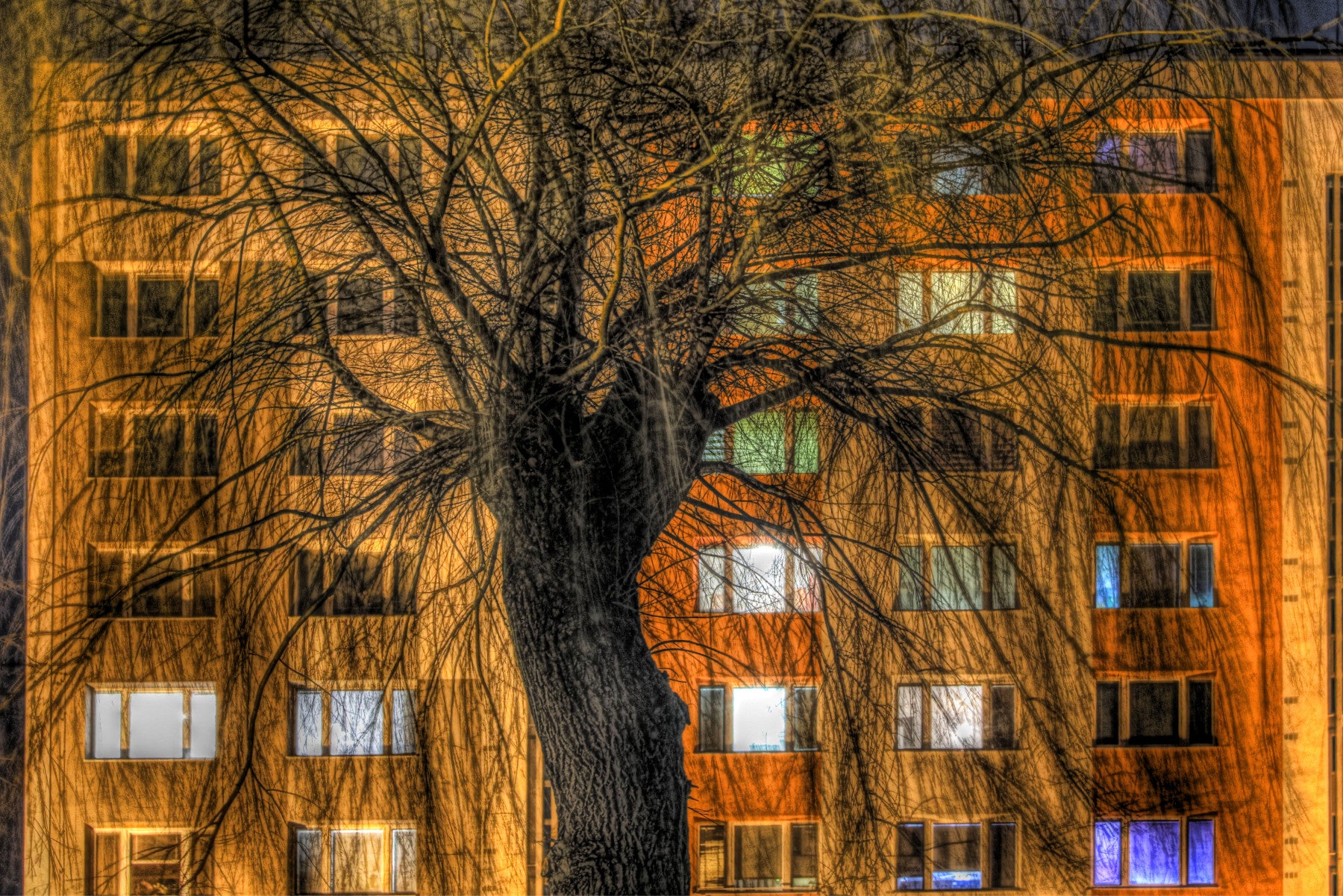 This striking piece presents a dramatic interplay between nature and urban life. The silhouette of a bare tree stands boldly against the warm glow of a building, revealing the contrast between organic forms and structured environments. Perfect for adding a touch of modern elegance to your living space, this piece invites contemplation and conversation. Enhance your home or office with this unique portrayal of urban tranquility.