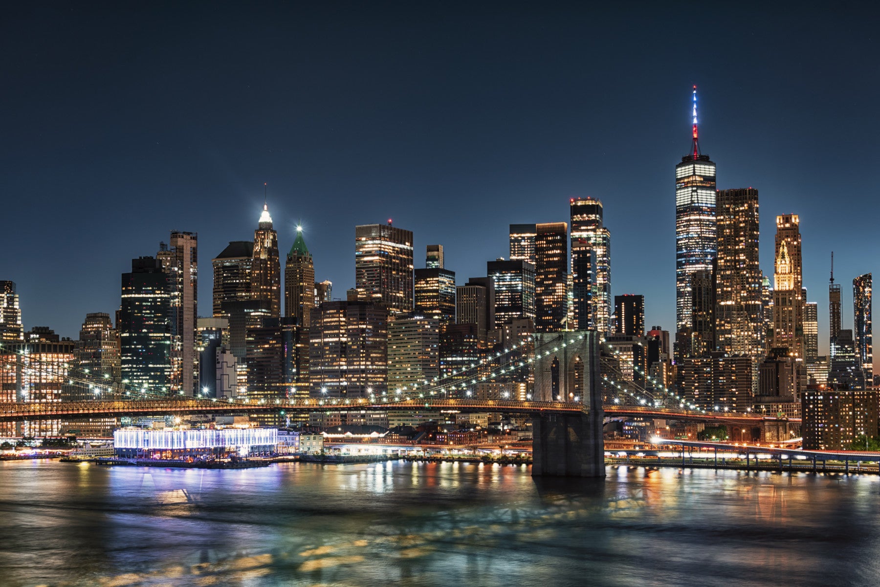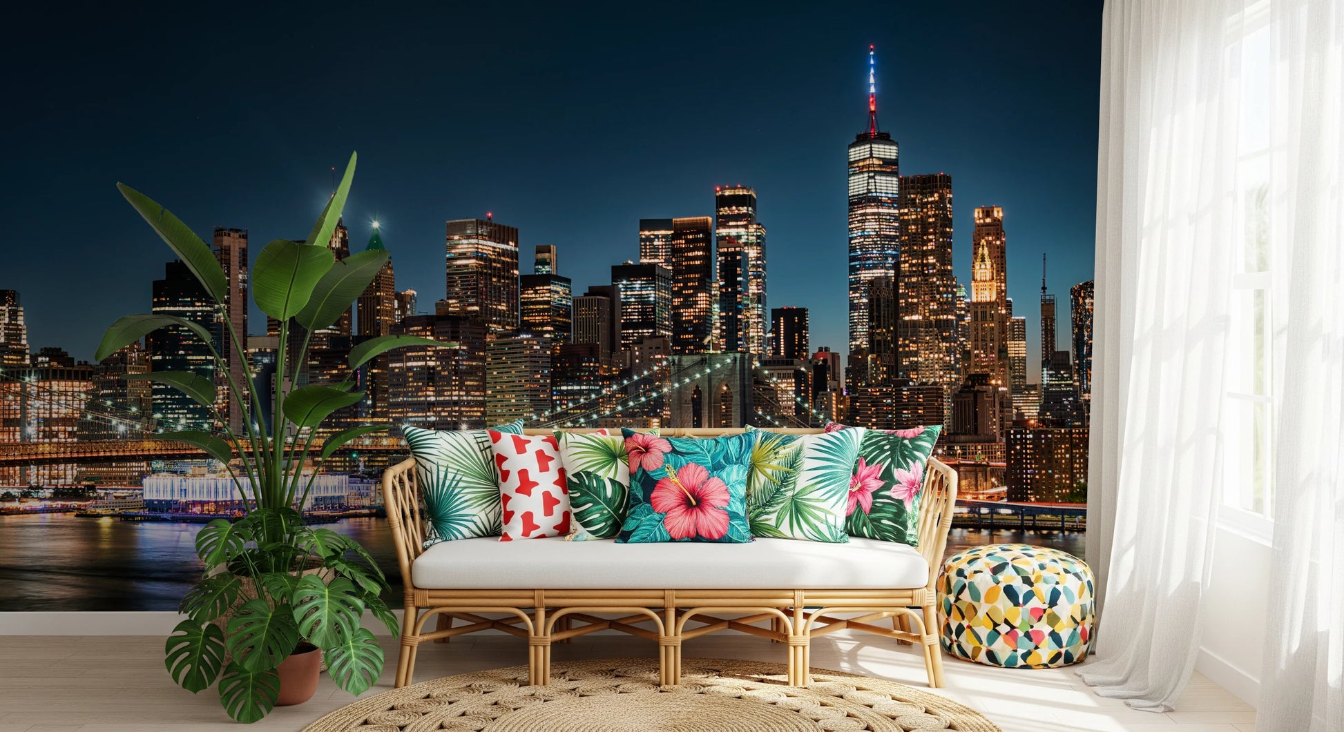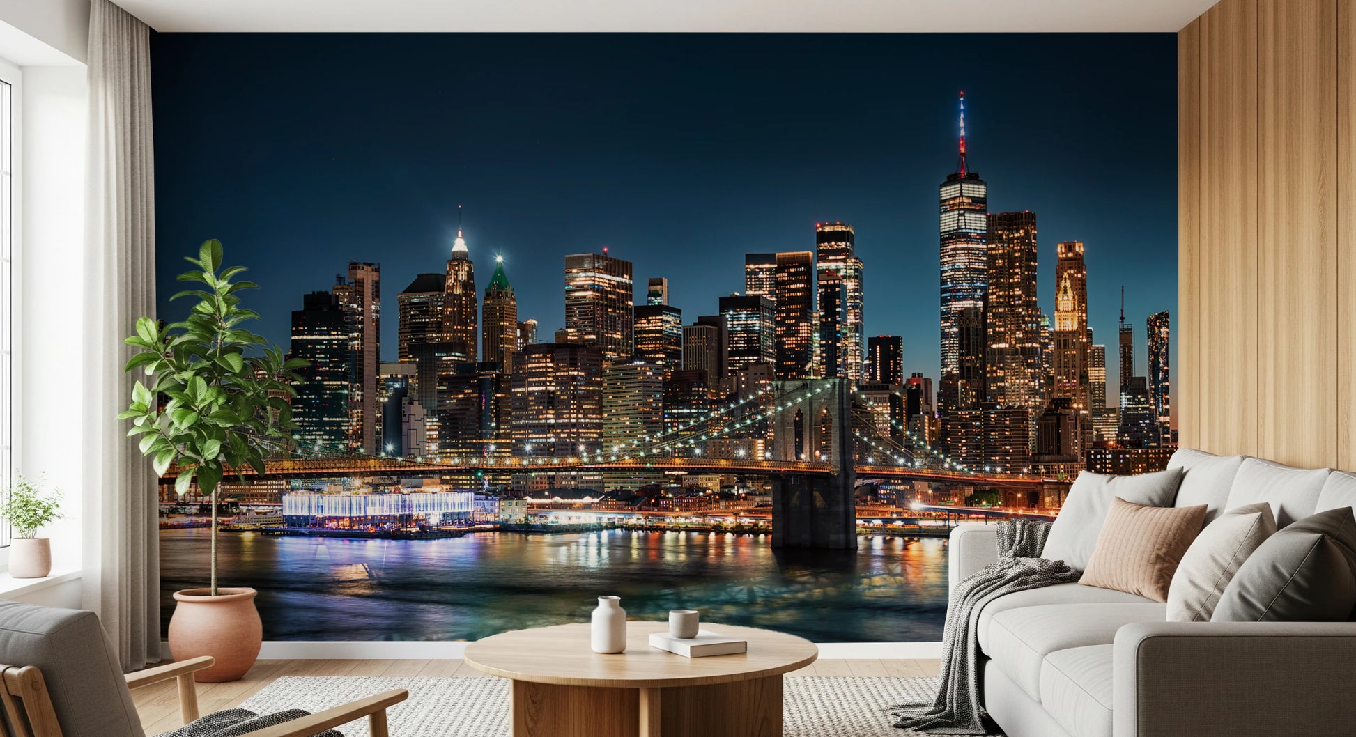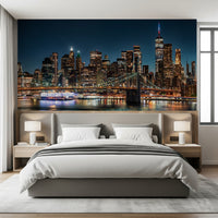 Elevate your space with a dynamic urban nightscape. This breathtaking wallpaper for walls features the sparkling lights of New York City and the majestic Brooklyn Bridge reflected on the water. The dominant colors are a deep indigo and amber that capture the nighttime ambiance. The wallpaper creates a focal point in any room. Consider installing it in a dining area or a loft to bring the vibrant energy of the city to your interior. Add a touch of sophisticated charm with this statement piece.